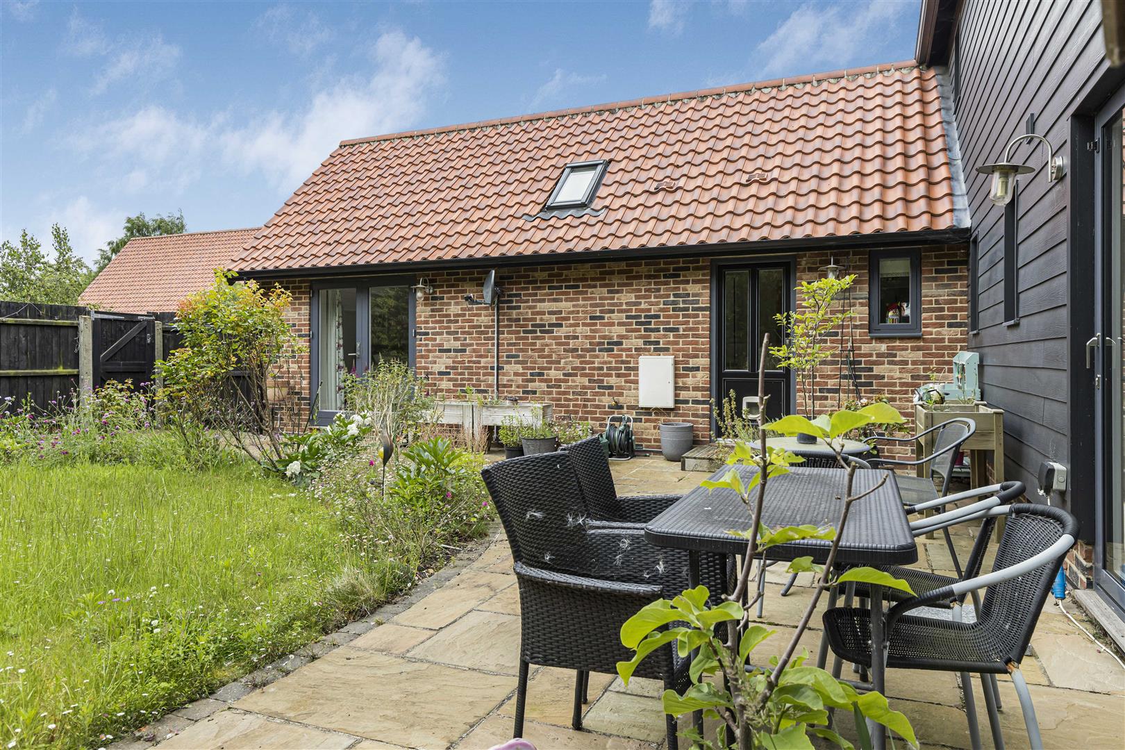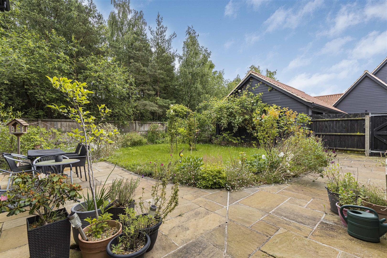Well landscaped South facing rear garden with extensive paved patio, lawn area, variety of mature shrubs and flowers, outdoor lighting and side pedestrian gate.