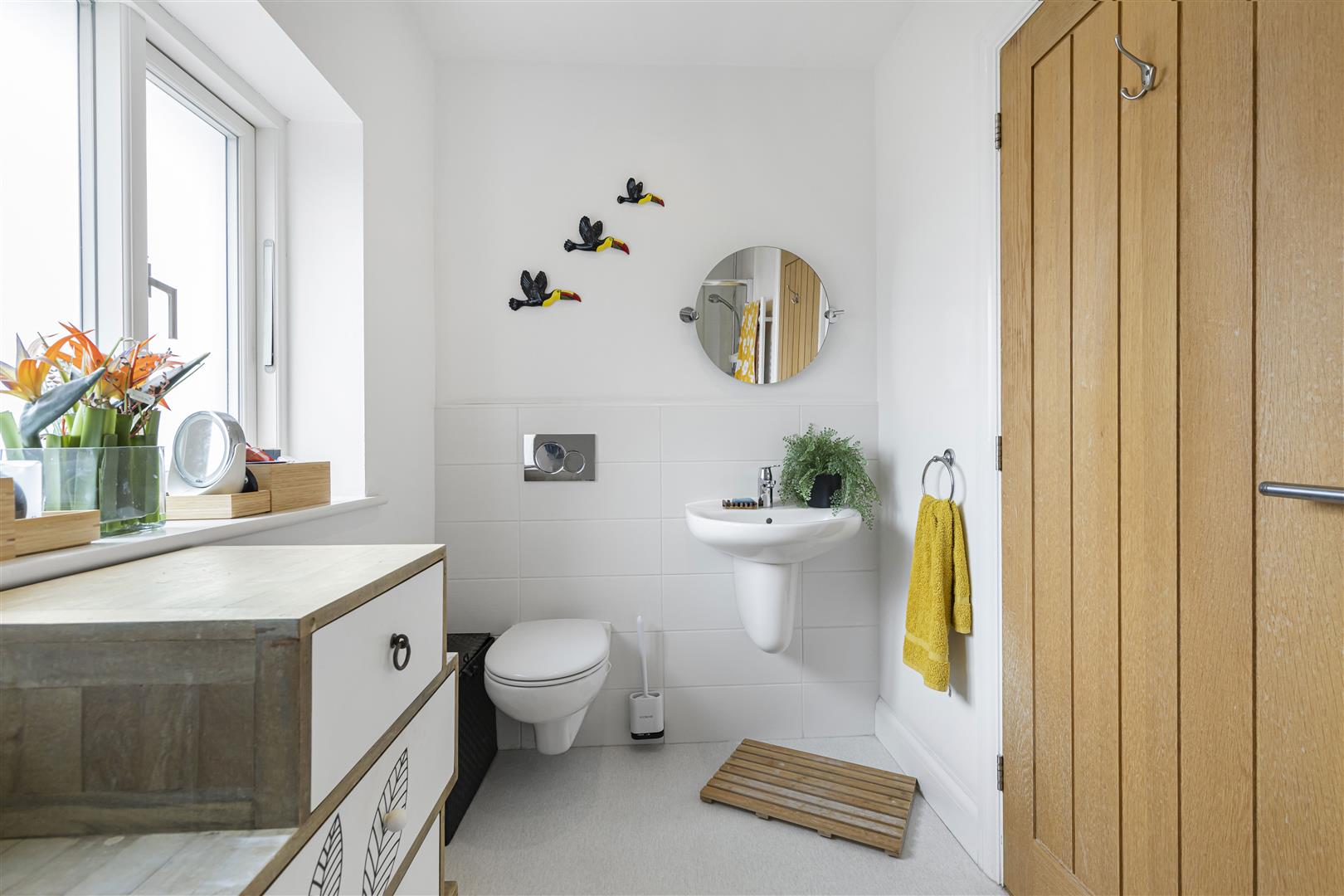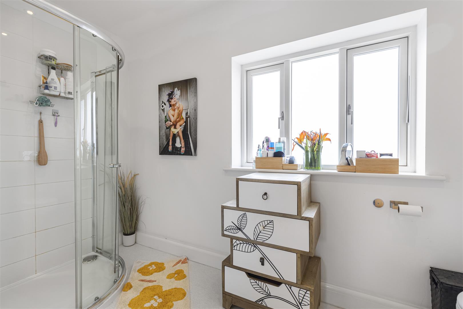 Three piece suite comprising a concealed WC, wash basin, enclosed shower cubicle, part tiled walls and obscured window to the side aspect.