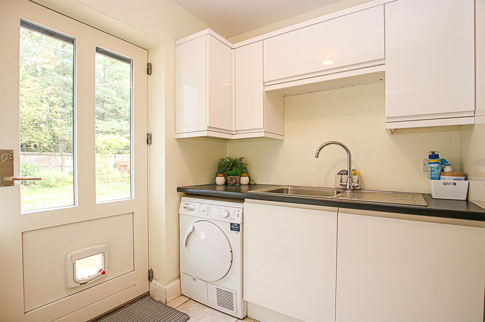 Fitted with base and wall storage units and working surfaces over, inset stainless steel sink and drainer with mixer tap, space and plumbing for washing machine. laid Porcelanosa tiled flooring and external door out to the rear garden.