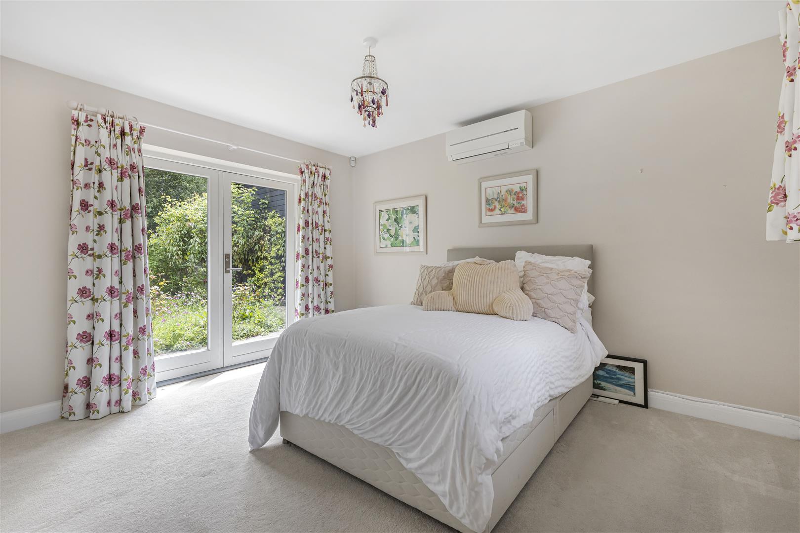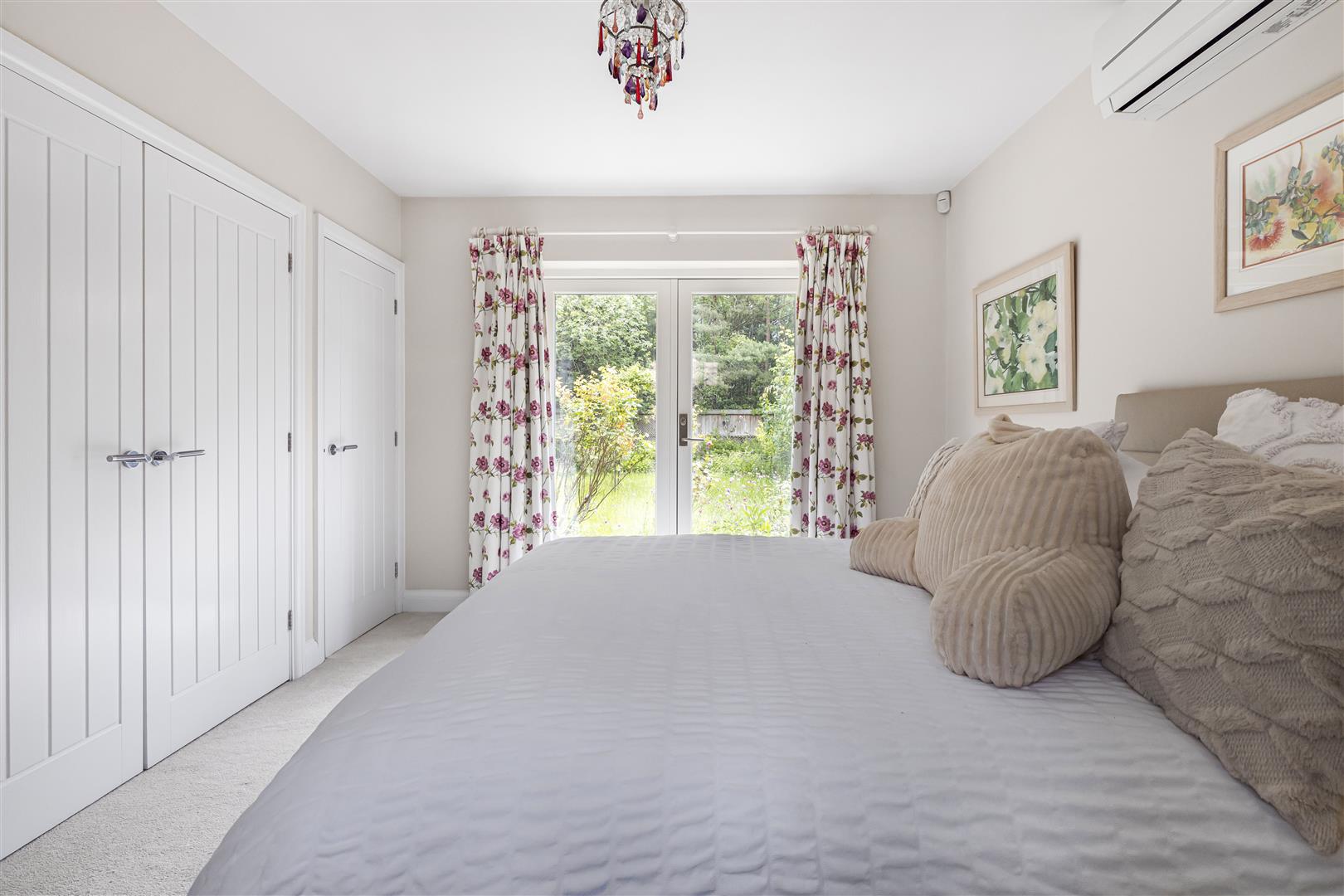 Double bedroom with air conditioning unit, fitted double wardrobes, a further storage cupboard, window to the front aspect, French style doors out to the rear garden and door through to the: