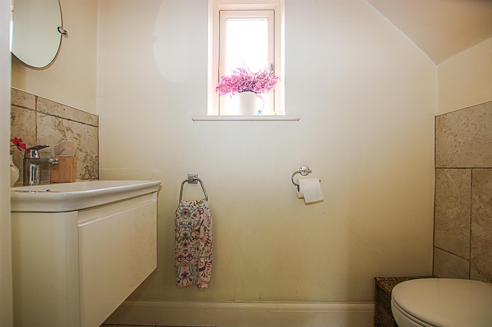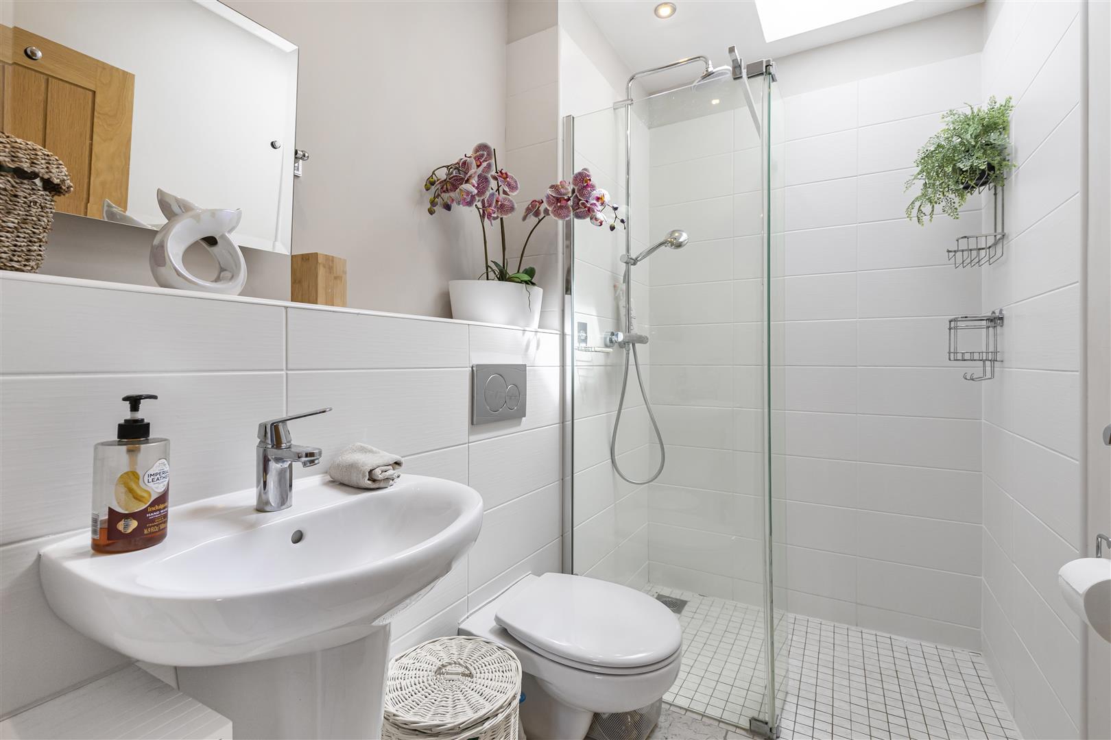 Three piece bathroom suite comprising a concealed WC, wash basin, walk-in shower with glass screen, part tiled walls, tiled flooring and Velux window.