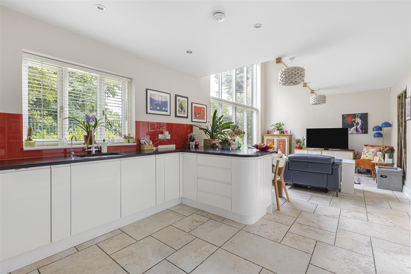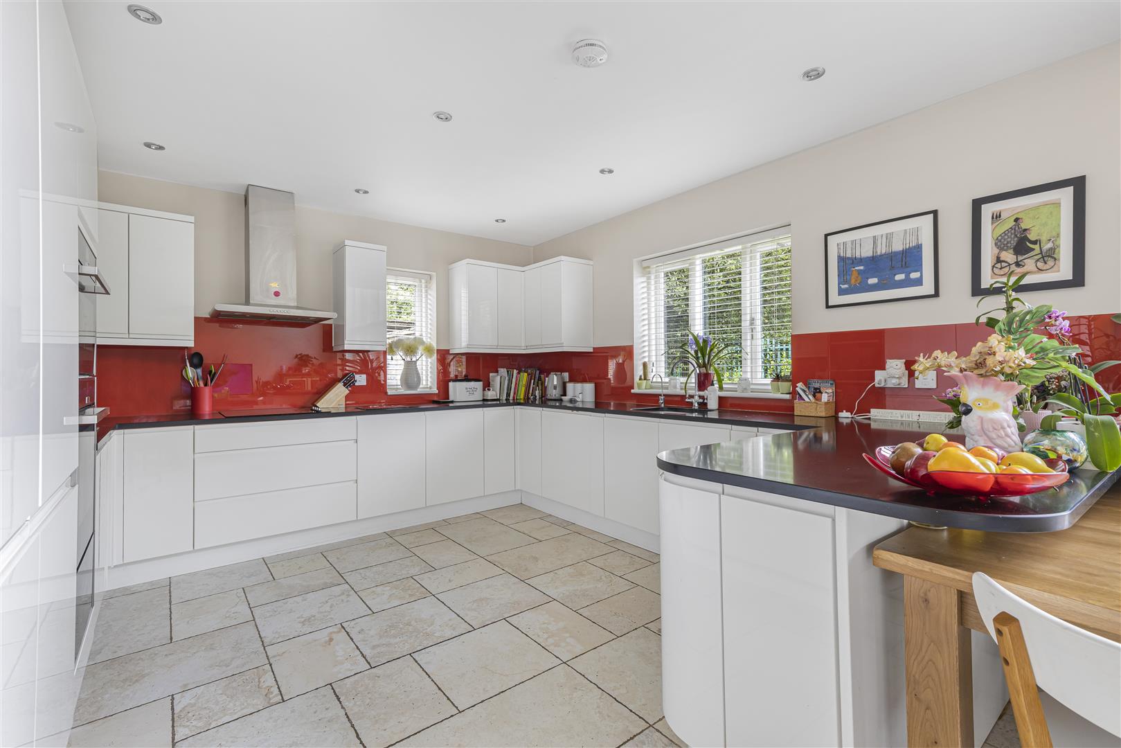 Modern fitted kitchen with a variety of matching eye and base level fitted storage units and working surfaces over, undermounted ceramic sink with mixer tap and separate hot water tap. Integrated appliances to include NEFF hob with extractor hood above, NEFF double eye level oven, NEFF warming drawer, fridge/freezer and dishwasher. Water softener system located under the kitchen sink, breakfast bar, laid Porcelanosa tiled flooring, and windows to the front and side aspect.