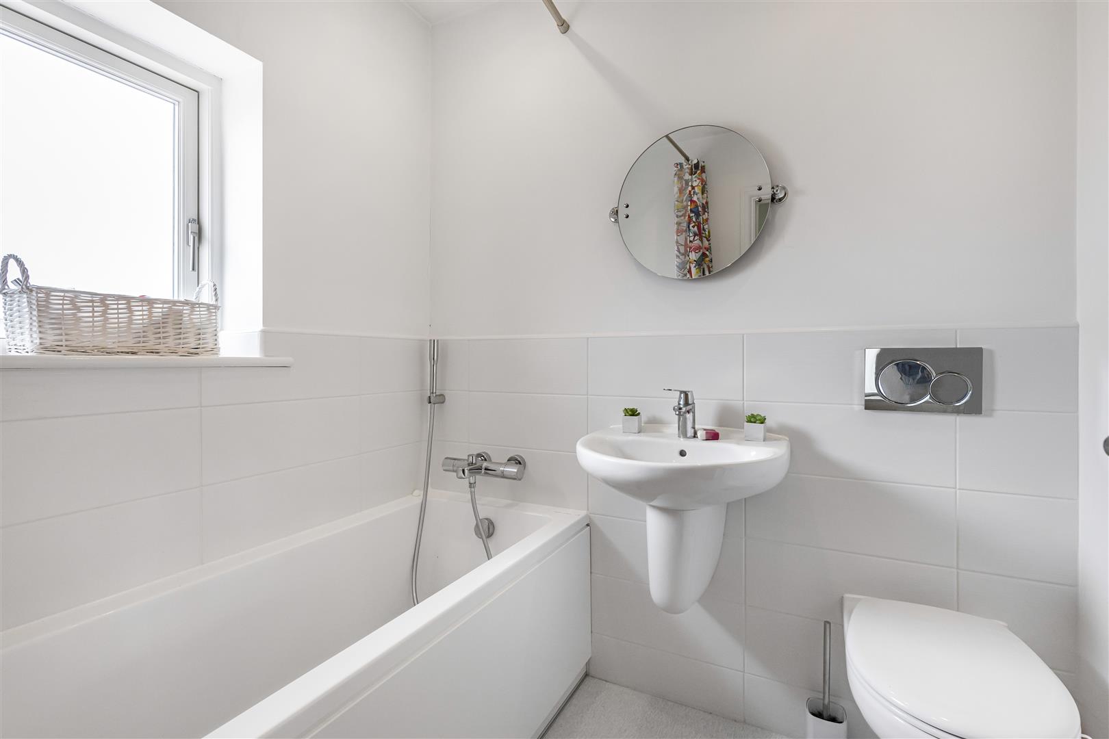 Three piece bathroom suite comprising a concealed WC, wash basin, panelled bath with shower attachment, part tiled walls and obscured window to the front aspect.