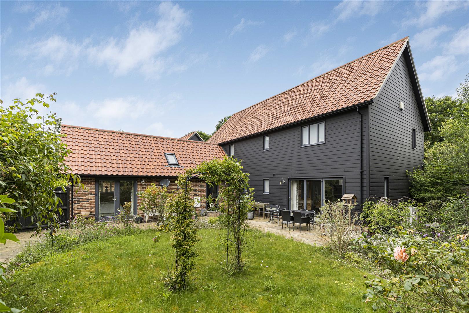 Well landscaped South facing rear garden with extensive paved patio, lawn area, variety of mature shrubs and flowers, outdoor lighting and side pedestrian gate.