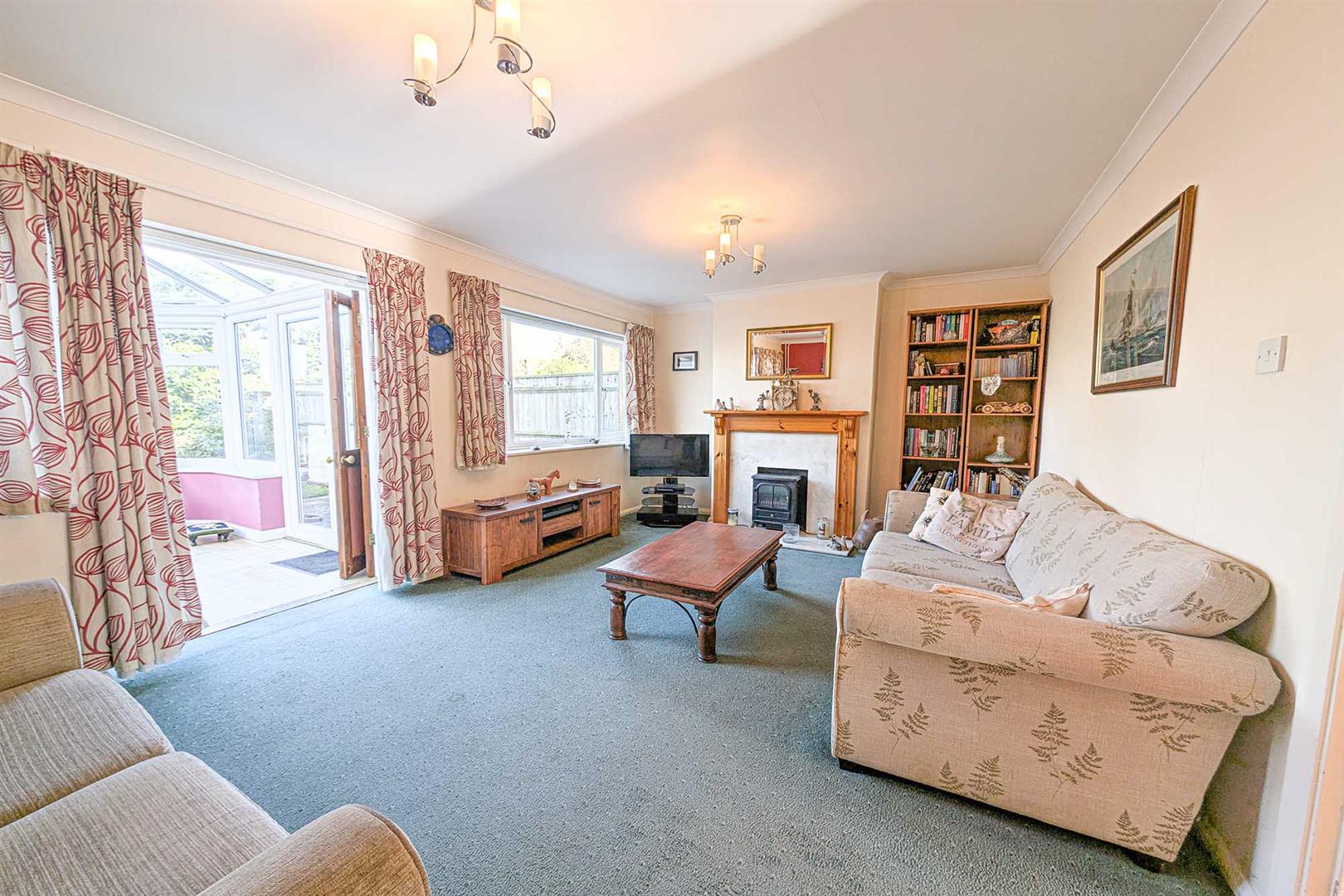 Spacious, well presented living room with feature fireplace with wooden surround and mantel, stone hearth. Half glazed, double doors leading to conservatory. Window overlooking rear garden. Arched opening leading to dining room.