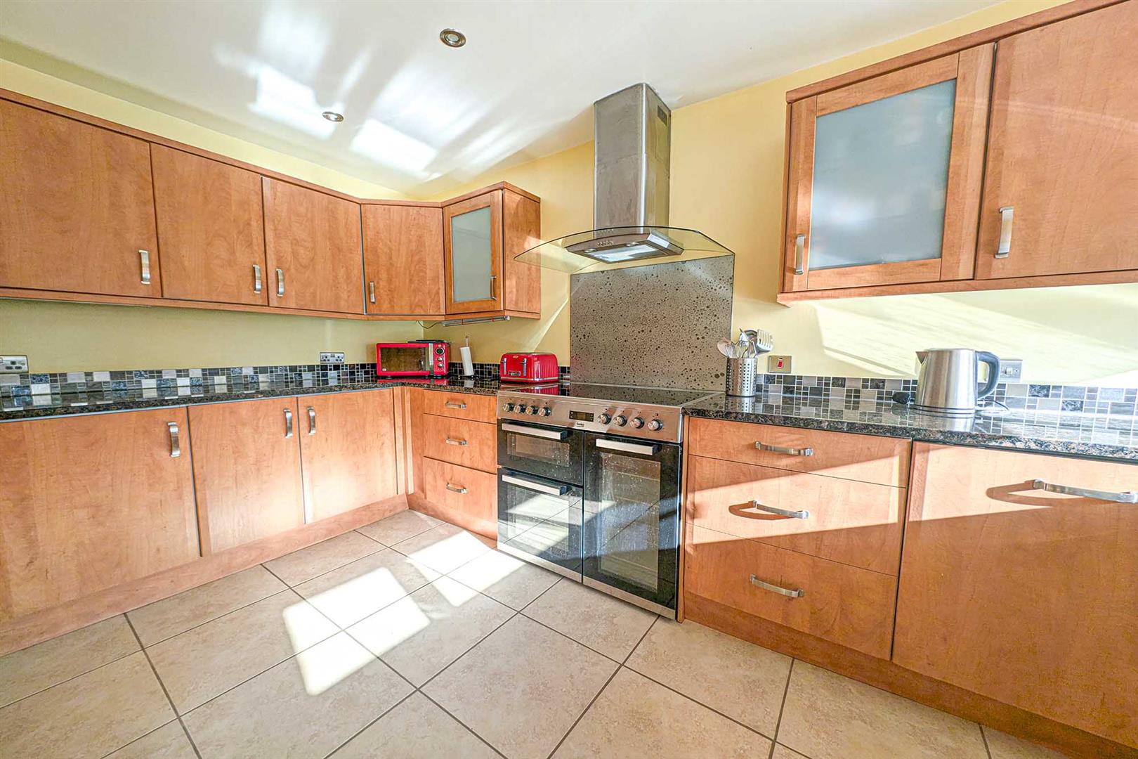 Modern kitchen with a range of matching eye and base level cupboards with granite worktop over. Inset bowl sink with mixer tap over. Space and connection of electric range style cooker with attractive splashback and stainless steel and glass extractor over. Integrated dishwasher, fridge and freezer. Space and plumbing for washing machine and tumble dryer. Tiled flooring. Window overlooking rear aspect. Door to entrance hall.