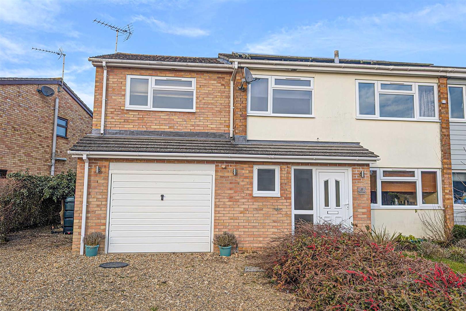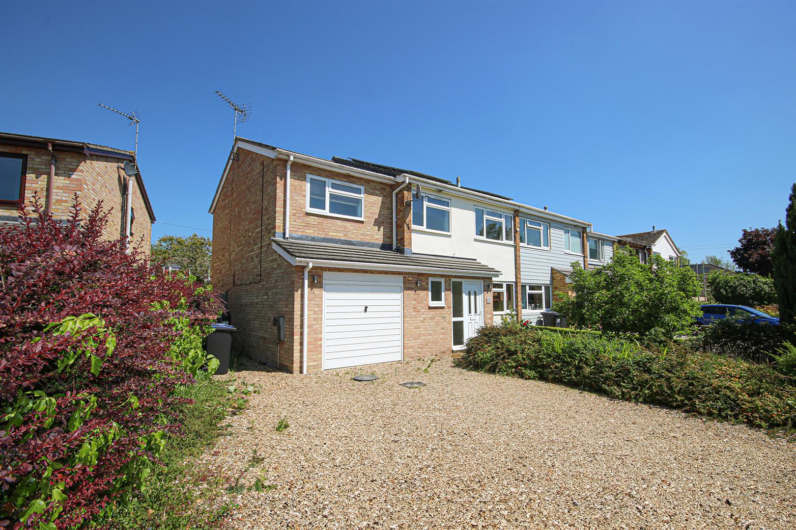 Gravelled driveway providing off road parking, edged with some mature shrub planting, leading to integral garage. Oil tank.