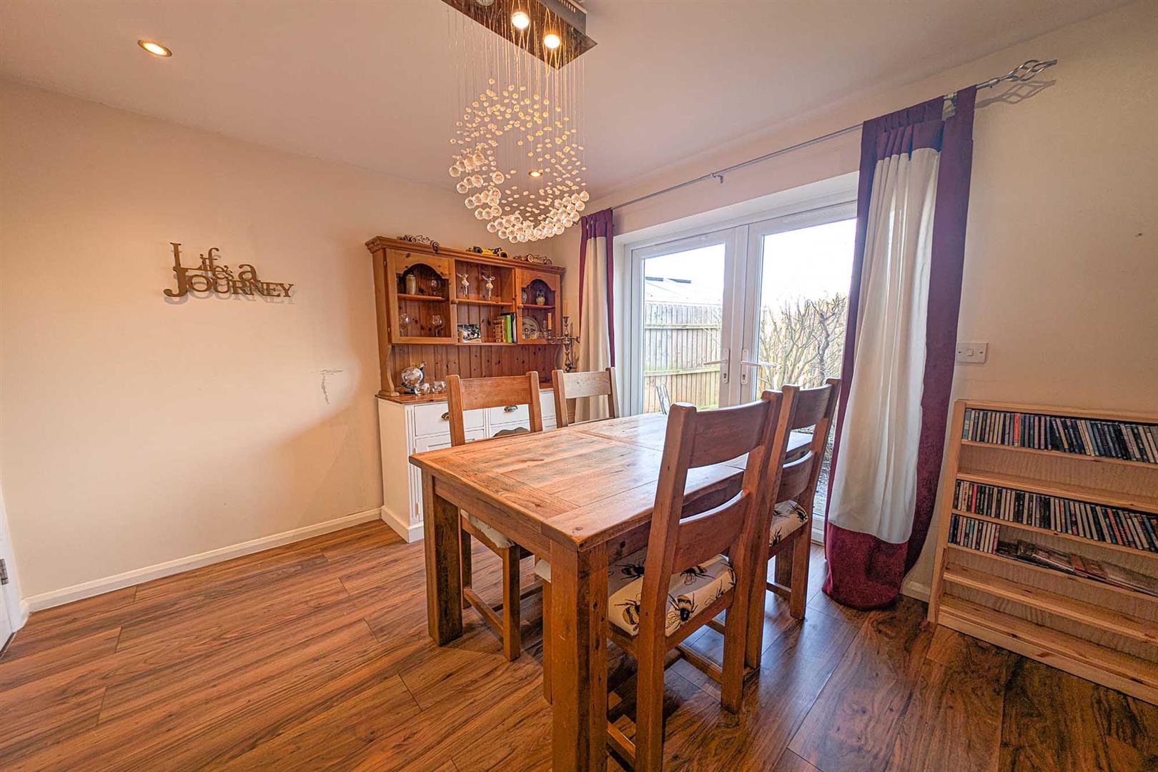 Generous conservatory with French doors leading to rear patio area. Parquet style flooring. Half glazed double doors to living room.