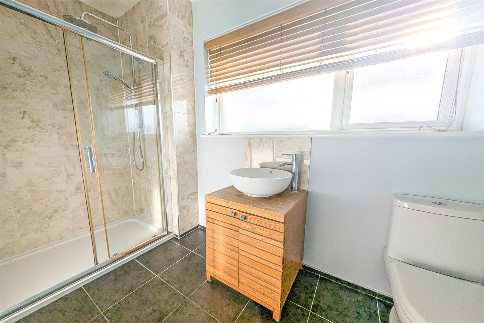 Contemporary en suite with low level W.C., bowl hand basin with mixer tap over and built-in storage cupboard under and generous walk-in shower with wall mounted and water-fall showers and sliding glass doors. Attractively tiled to wet areas. Tiled flooring. Obscured window. Radiator. Door to bedroom 1.