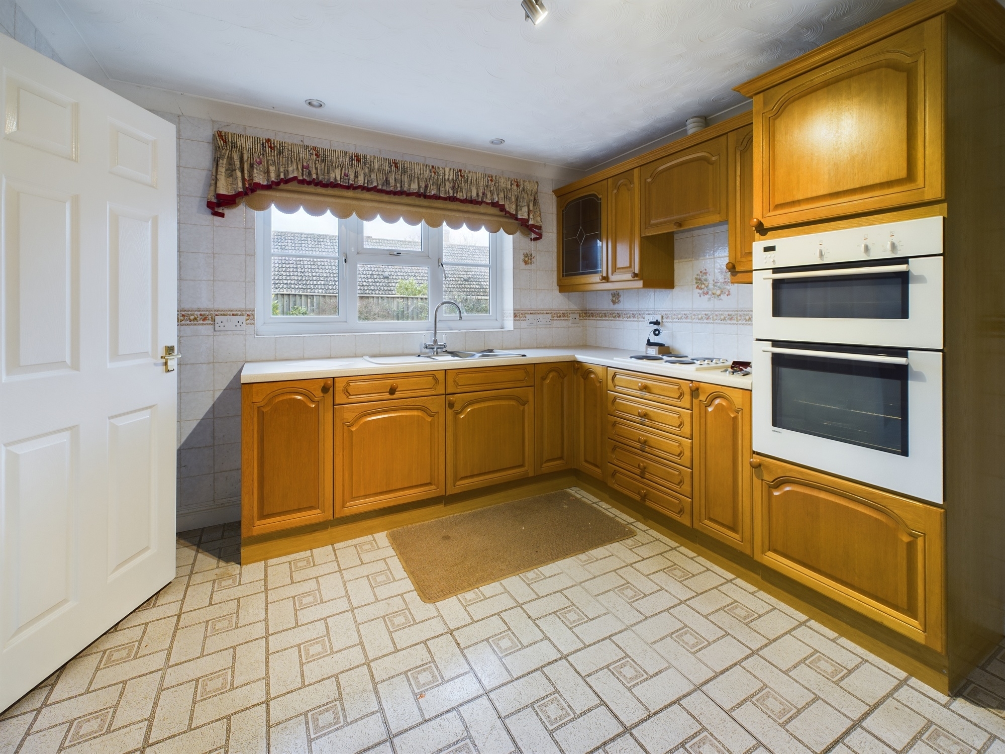 uPVC double glazed window to rear, wall mounted single panel radiator, wall and base units under round edge worktops, 1 1/2 sink drainer inset with mixer tap over, eye level double oven, 4 ring electric hob inset to work surface with extractor over, space for fridge/freezer, door through to:-