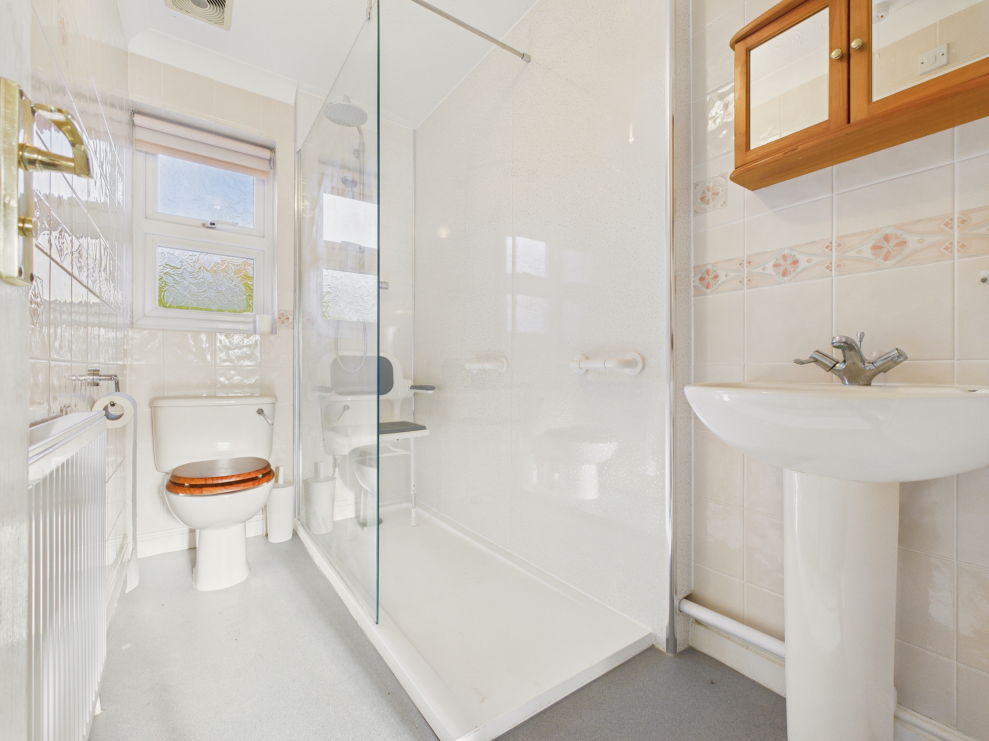 Walk in shower cubicle, low level w.c., wall mounted radiator, extractor fan, uPVC double glazed window to rear.