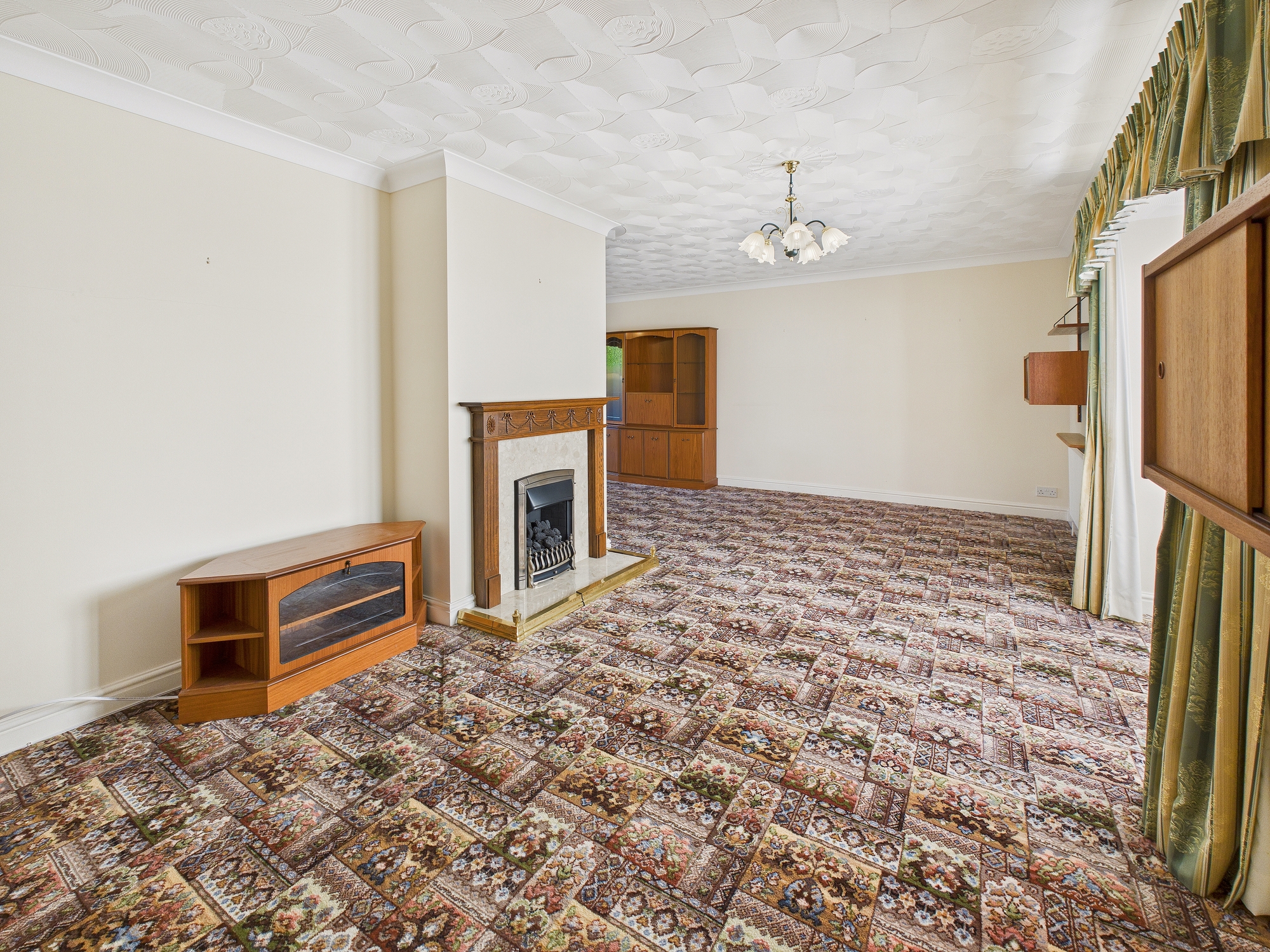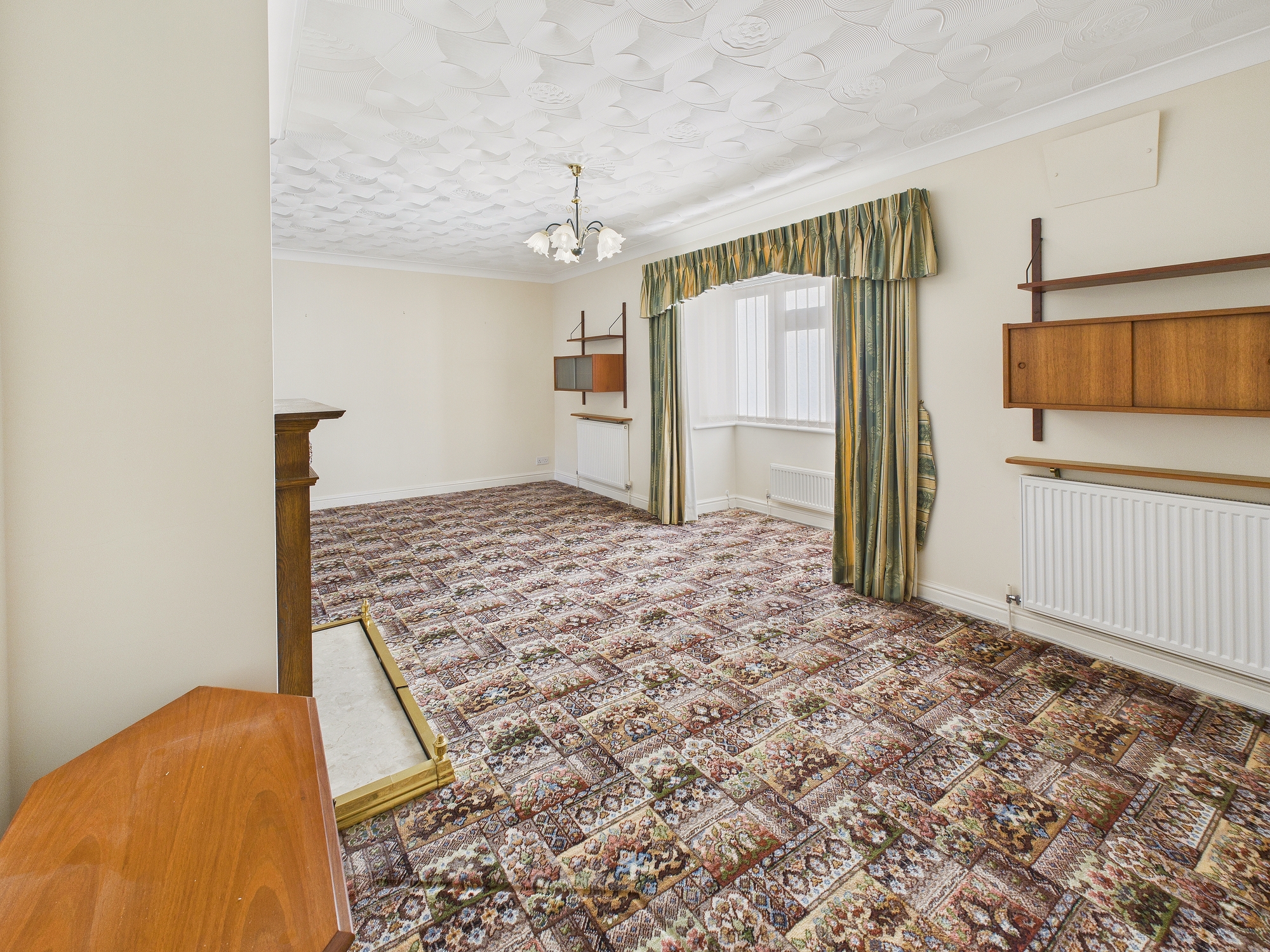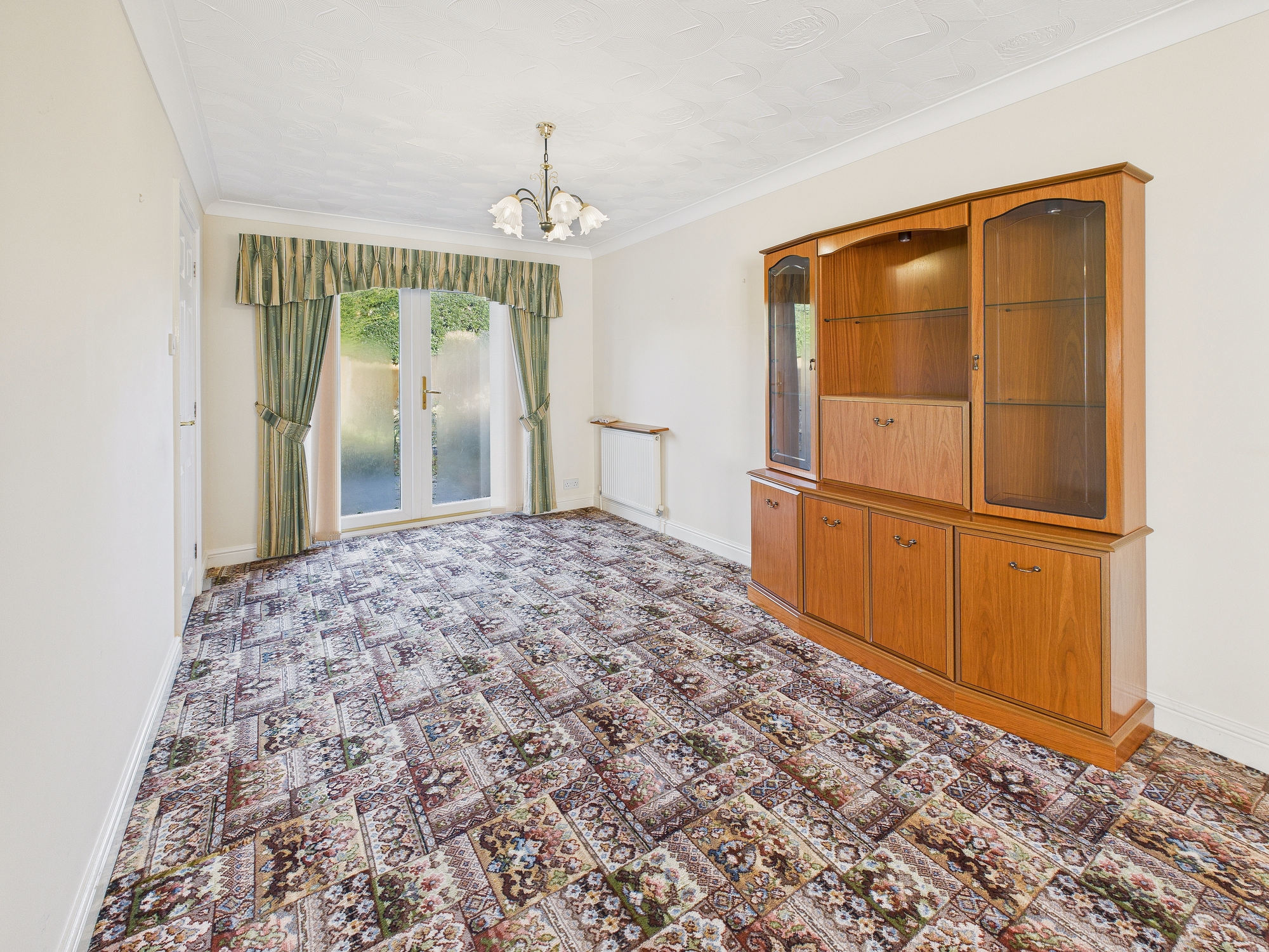 4 x wall mounted radiators, bay uPVC double glazed window to front, French doors to rear, feature fireplace with stone hearth and wooden surround.