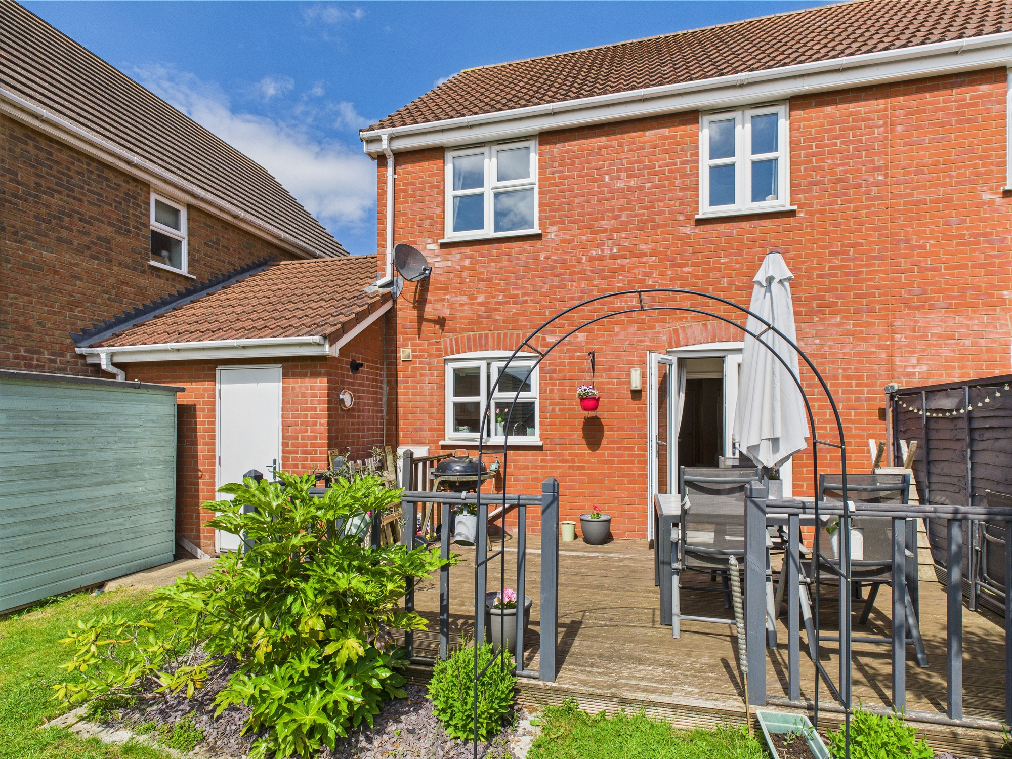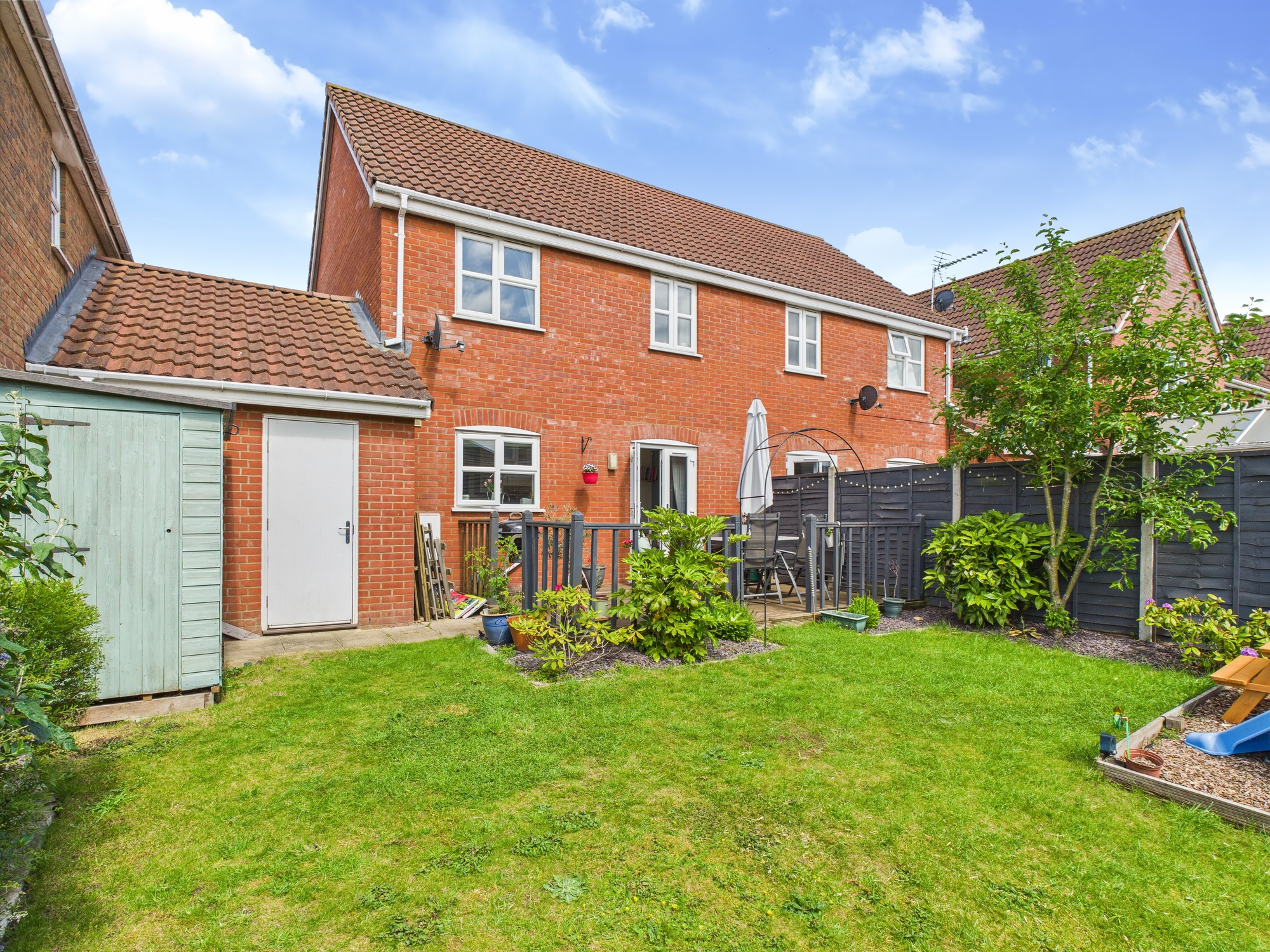 Located within this popular development is this well presented three bedroom, semi-detached property. The accommodation includes the entrance hall which serves the ground floor. The lounge is positioned to the front and the kitchen/diner has some integral appliances and patio doors through to the rear garden. There is also a cloakroom. The first floor landing provides access to the three well proportioned bedrooms, one of which has the benefit of built in wardrobes. Then there is the family bathroom. Externally there is a private driveway for off road parking and a garage with electric roller door. The rear garden is south facing, mainly laid to lawn with a decked area inset, all enclosed by fencing. Located with good access to the towns amenities and the train station on the King’s Lynn to London King’s Cross line via Cambridge.