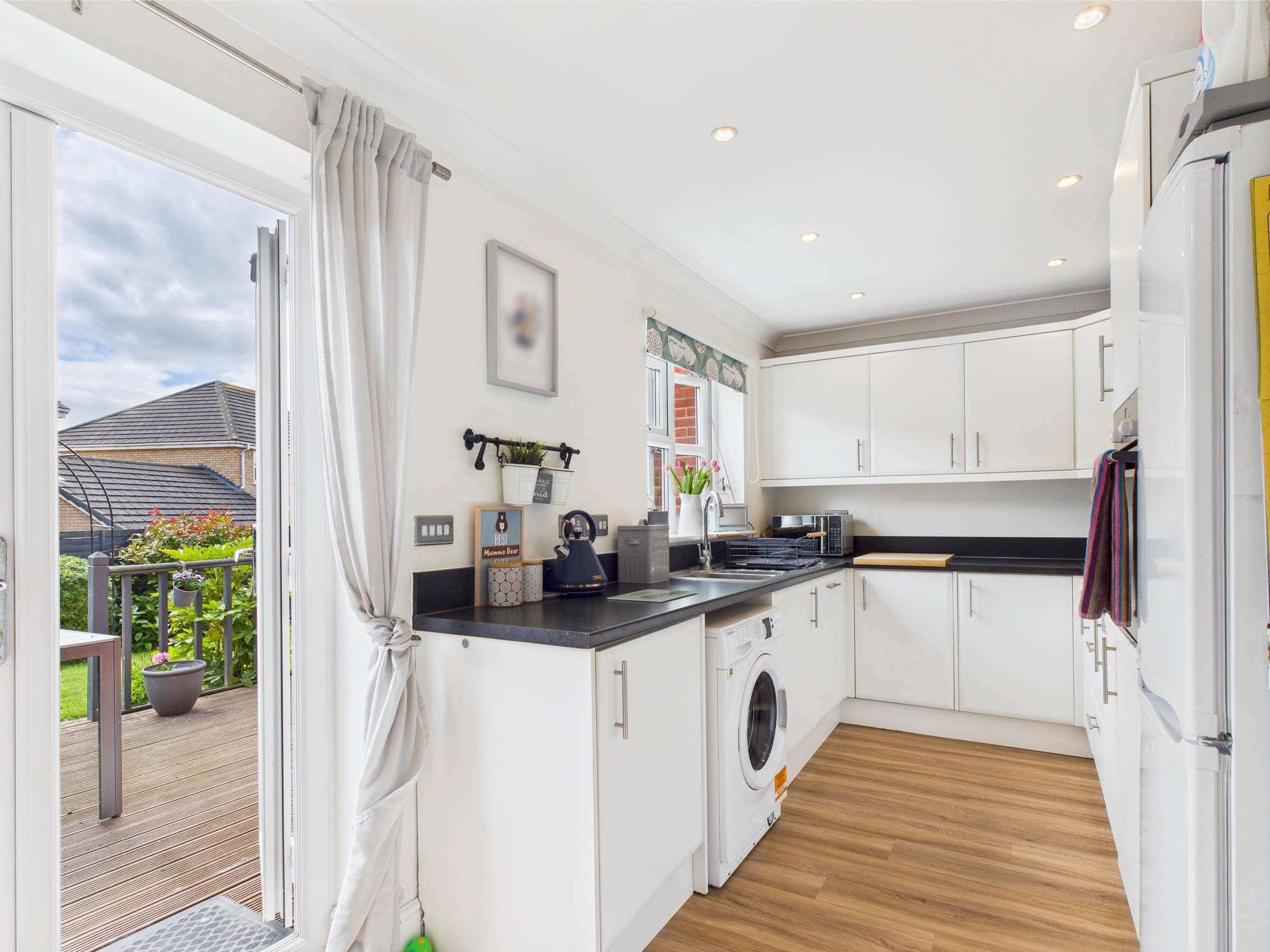 uPVC double glazed window to front, uPVC double glazed patio doors to rear, wall mounted double panel radiator, wall and base units under round edge worksurfaces, 1 1/2 stainless steel sink drainer inset with mixer tap over, 4 ring gas hob inset to worksurface with extractor over, eye level oven, integral dishwasher, space for washing machine, space for fridge/freezer, coved ceiling with spotlights inset.