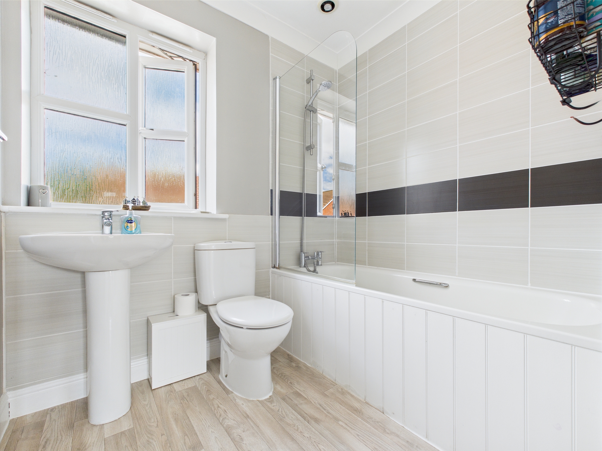 uPVC double glazed window to front, wall mounted heated towel rail, panelled bath with wall mounted shower and glass shower screen over, w.c., pedestal handwash basin, lino style flooring, coved ceiling with spotlights and extractor inset.