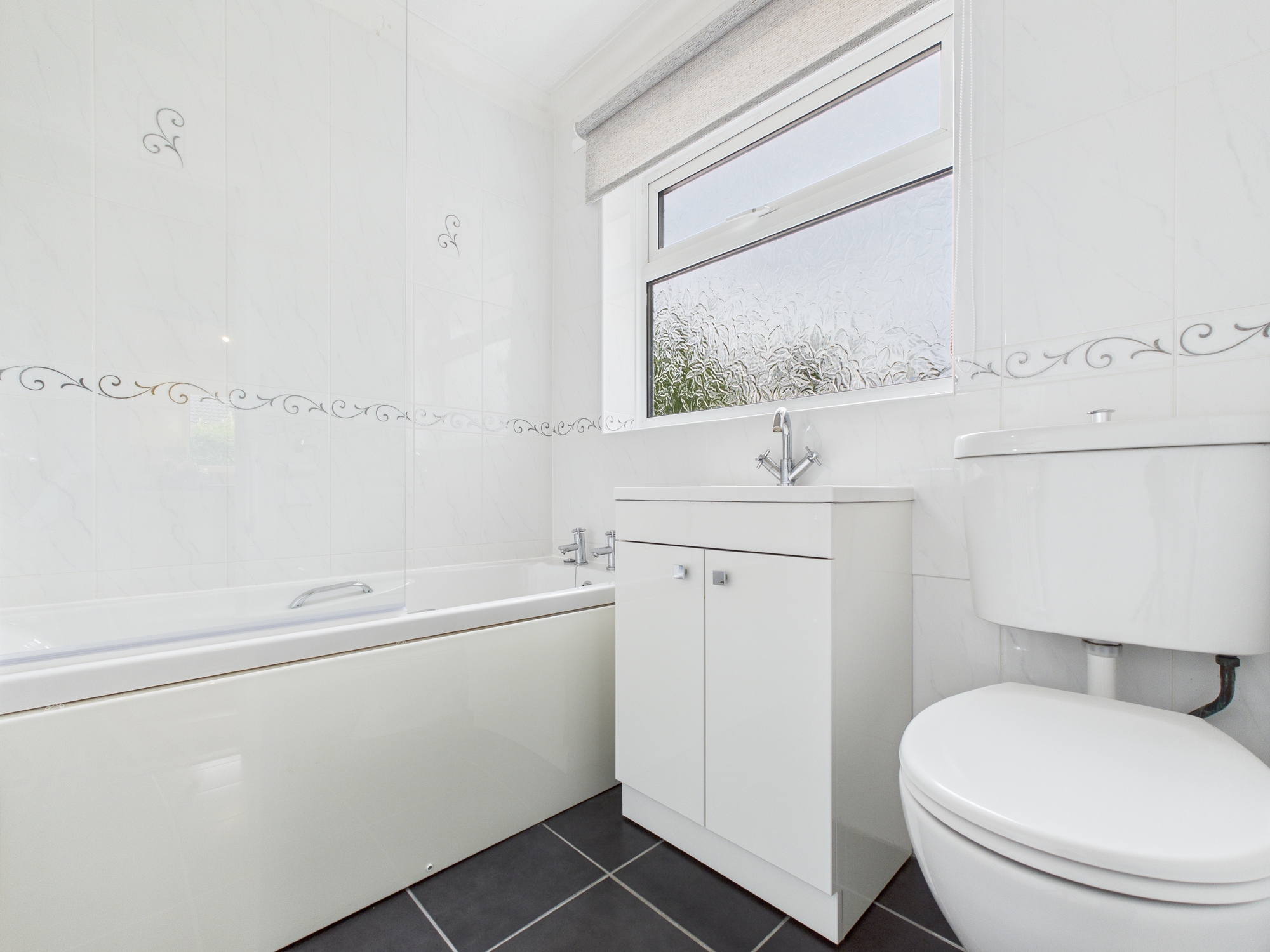 uPVC window to front aspect, tiled flooring, bath with shower over and glass shower screen, handwash basin inset to vanity unit, w.c., heated towel rail, tiling to walls.