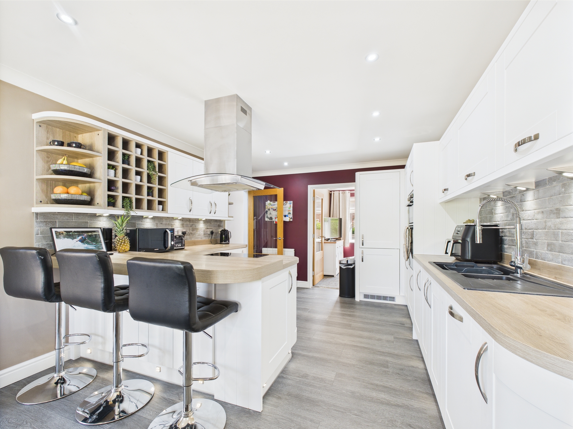 2 x wall mounted single panel radiator, uPVC double glazed window to rear, uPVC double glazed patio doors to rear, wall and base units under square edge worksurfaces with breakfast bar, 1 1/2 sink drainer inset with mixer tap over, 4 ring “Neff” hob inset to worksurface with stainless steel extractor over, eye level double oven, integral dishwasher, integral fridge/freezer, laminate style flooring, ceiling spotlights and coving, door to utility room, door to:-