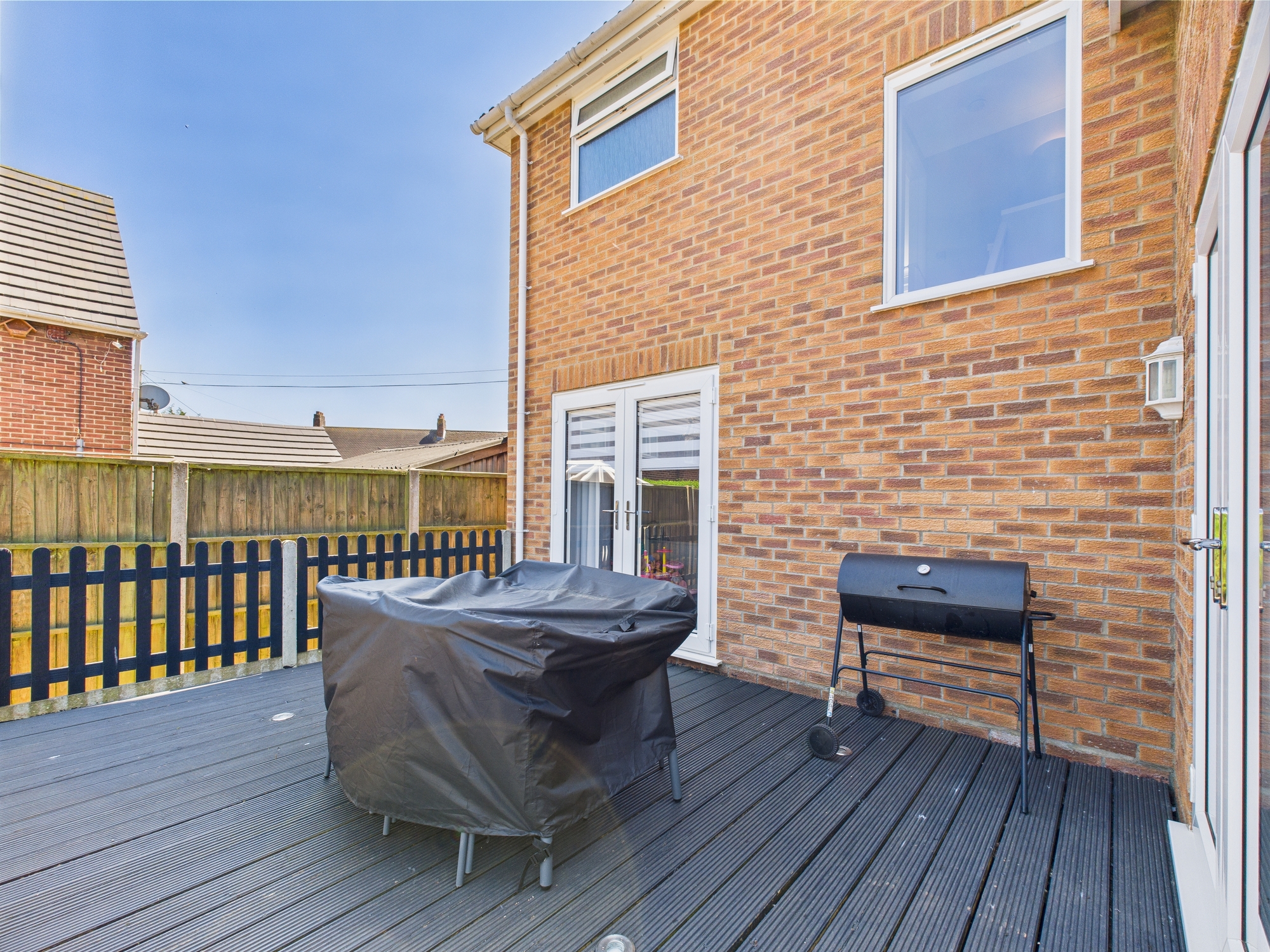 To the front of the property it is laid to shingle with a concrete driveway providing off road parking and leads to the garage. A personal gate leads through to the rear garden which is laid to lawn with an area laid to decking and steps leading to the sunken patio. There is also a wooden storage shed with mains electricity. There are also two external power sockets, one at the rear of the property along with one at the front.