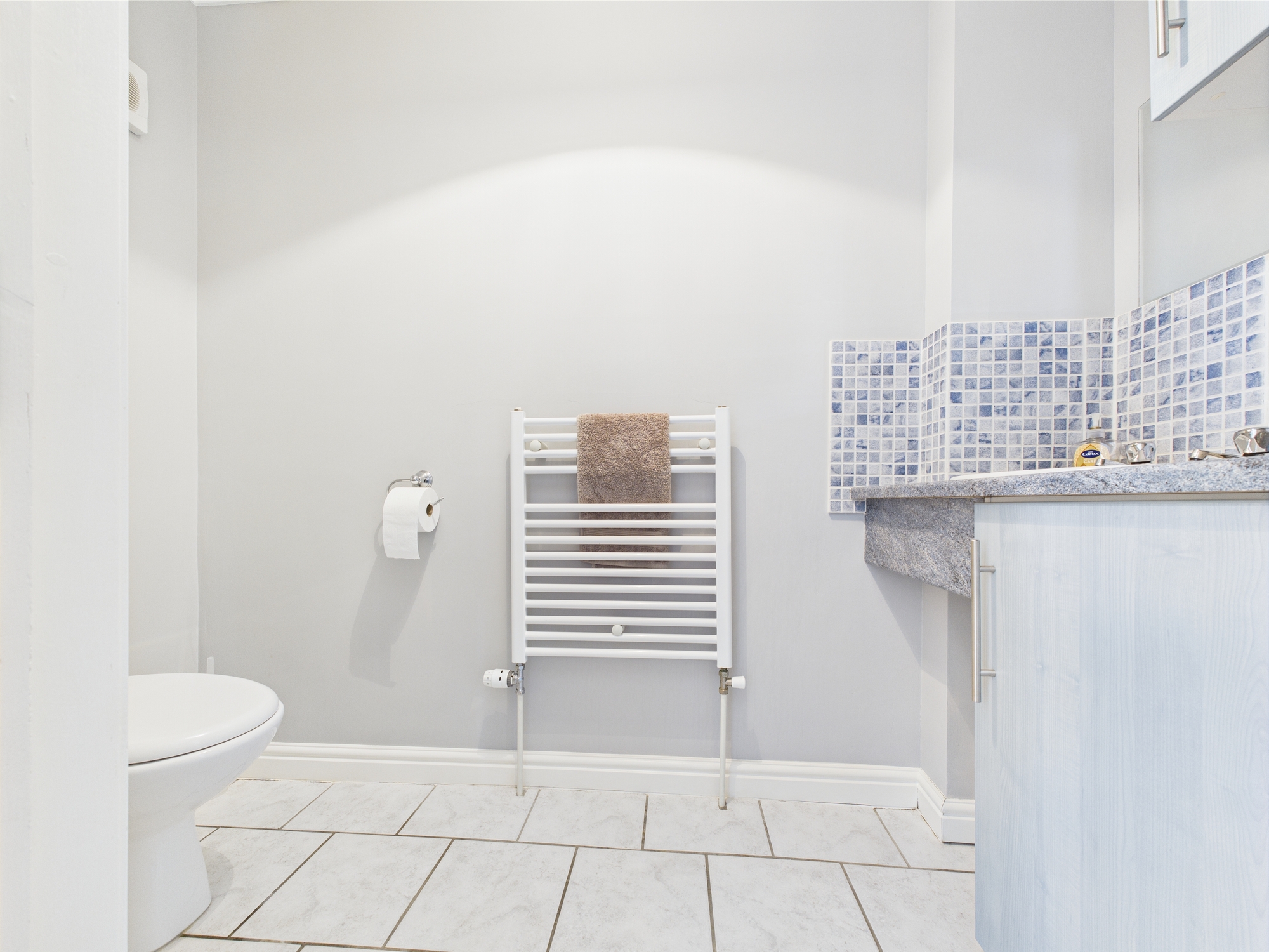 Wall mounted heated towel rail, w.c., handwash basin inset to vanity unit, tiled flooring, coved ceiling and extractor.