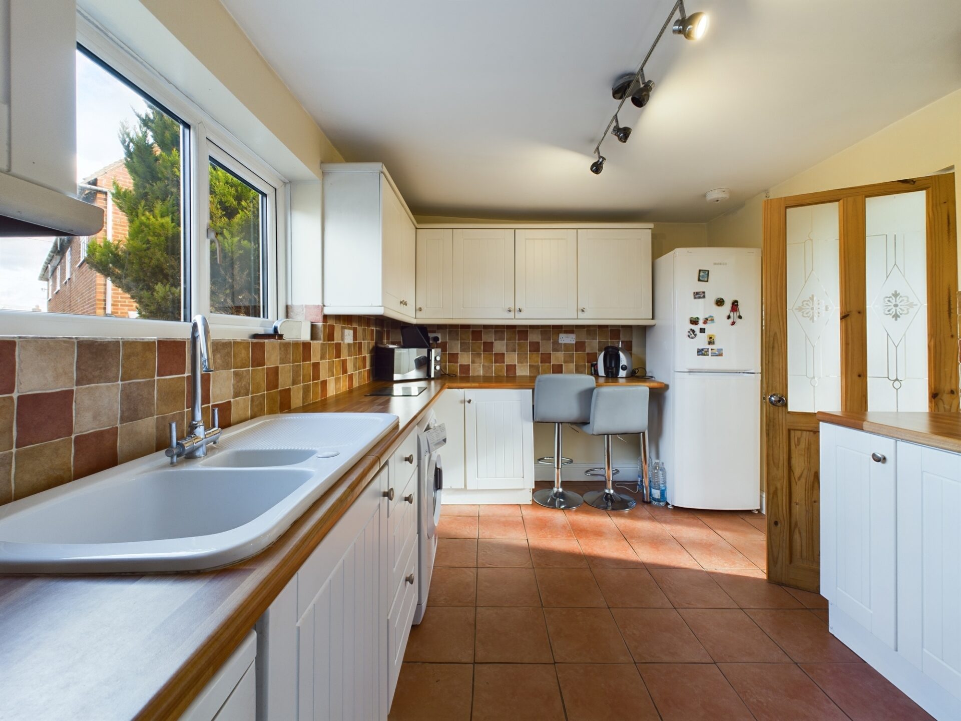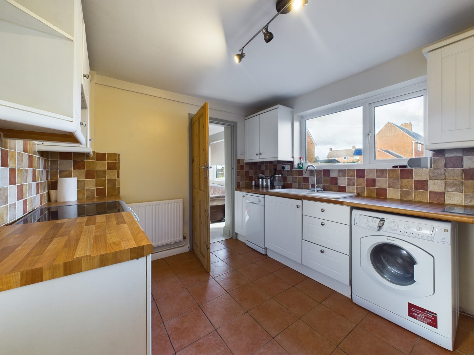 UPVC double glazed window to front aspect, wall mounted single panel radiator, fitted with a range of ‘Shaker’ style wall and base units under round edge worktops, inset 1 1/2 ceramic sink and drainer unit with mixer tap over, space for cooker, space for fridge/freezer, spaces for washing machine, tumble drainer and dishwasher, tiled flooring, part tiled walls, door to rear lobby.