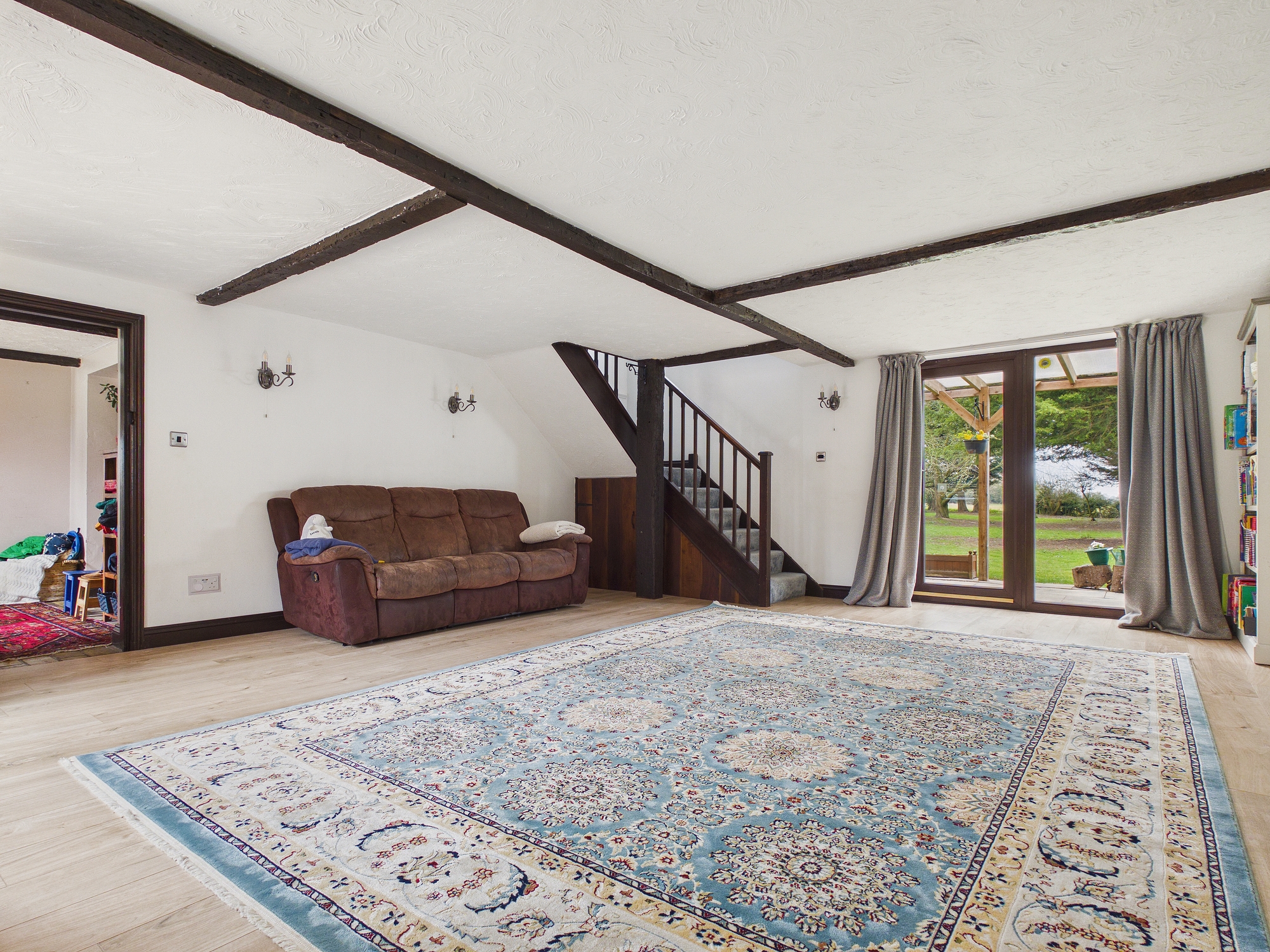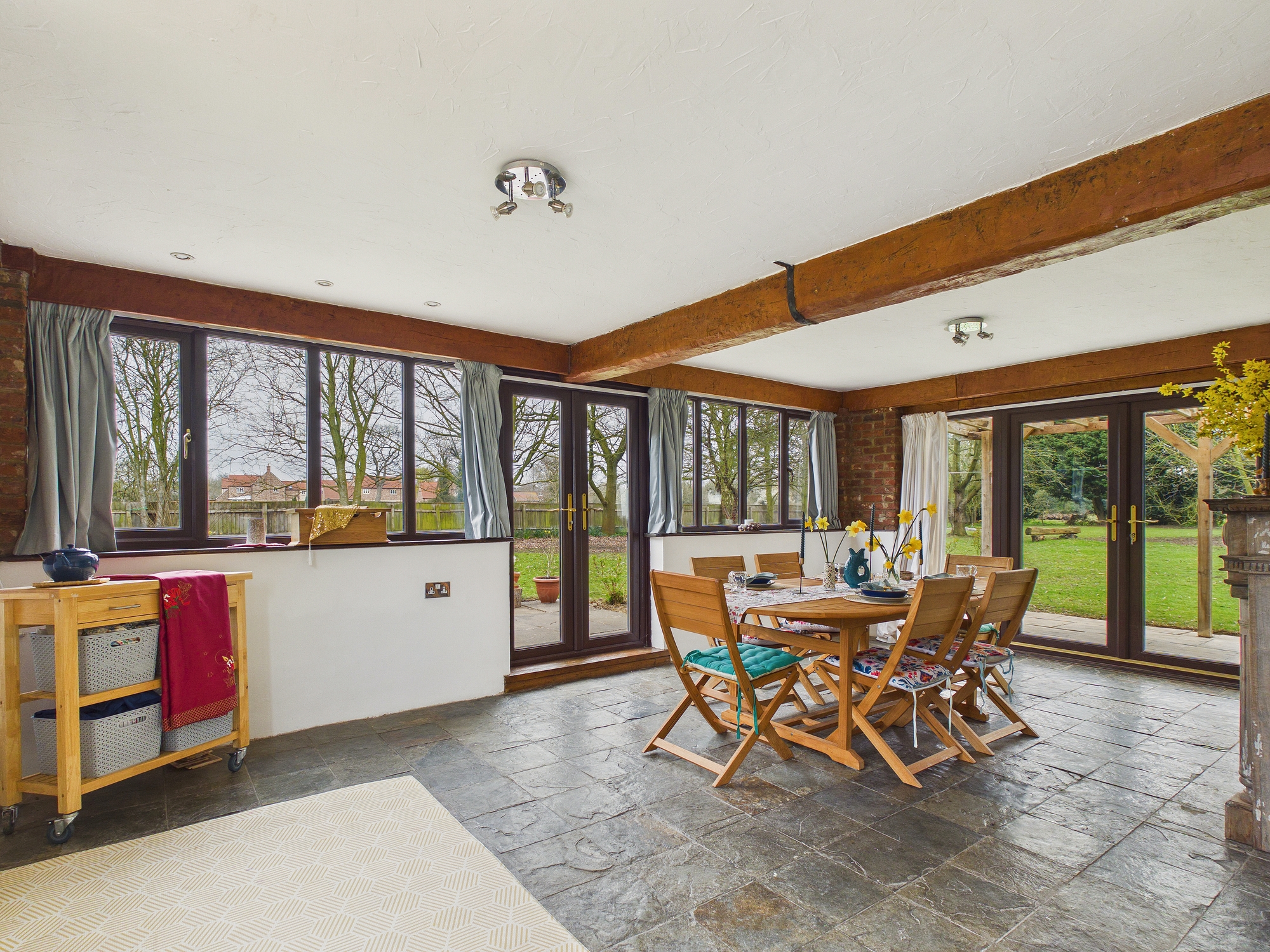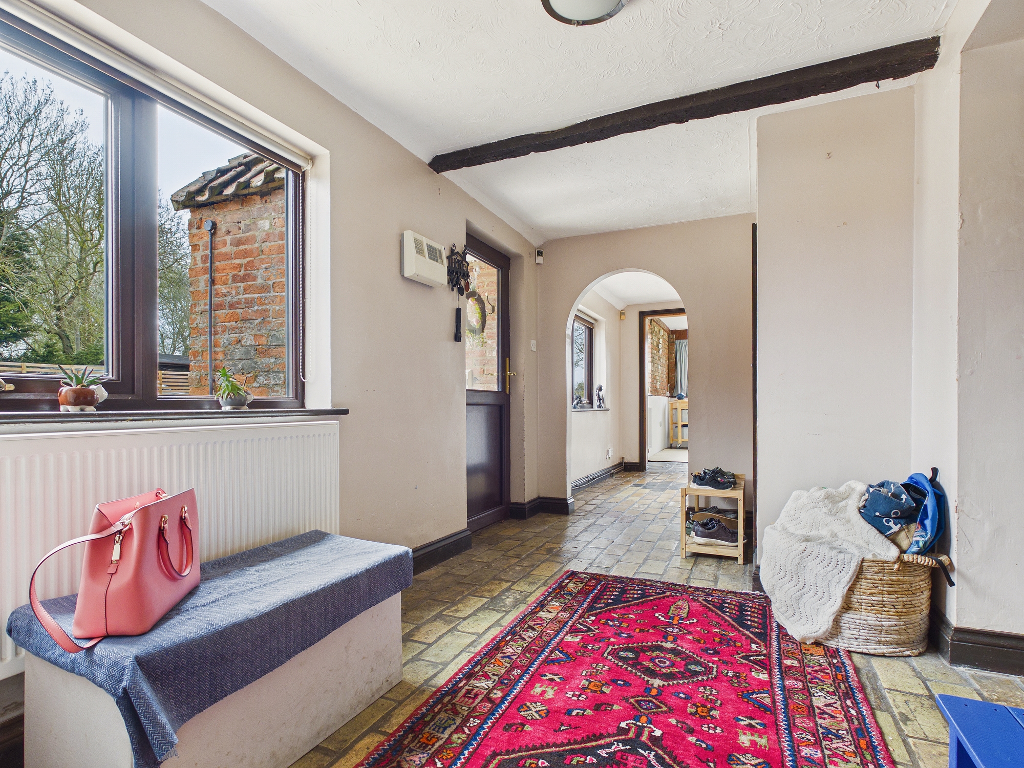 uPVC double glazed windows to front, side and rear, uPVC double glazed French doors to side and rear, 2 x wall mounted double panel radiator, tiled flooring, mock beam to ceiling.