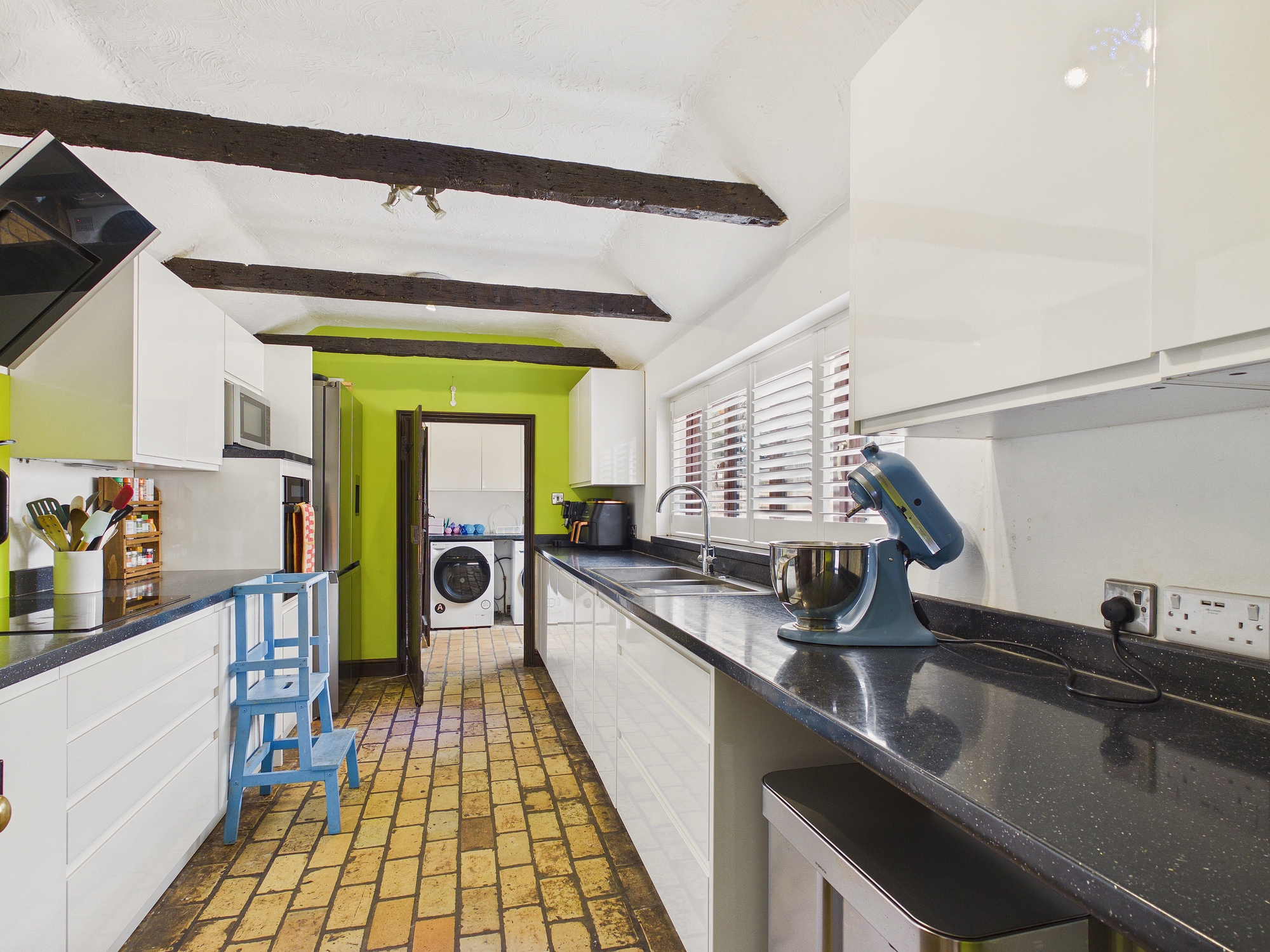uPVC double glazed door to rear, worksurface with spaces for washing machine and tumble drier, wall mounted gloss finish units, loft access, door to storage cupboard, door to:-