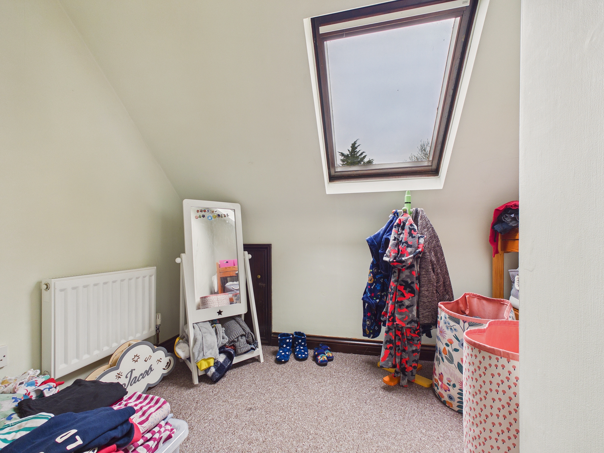 Velux style window to front, wall mounted single panel radiator, door to eaves storage.