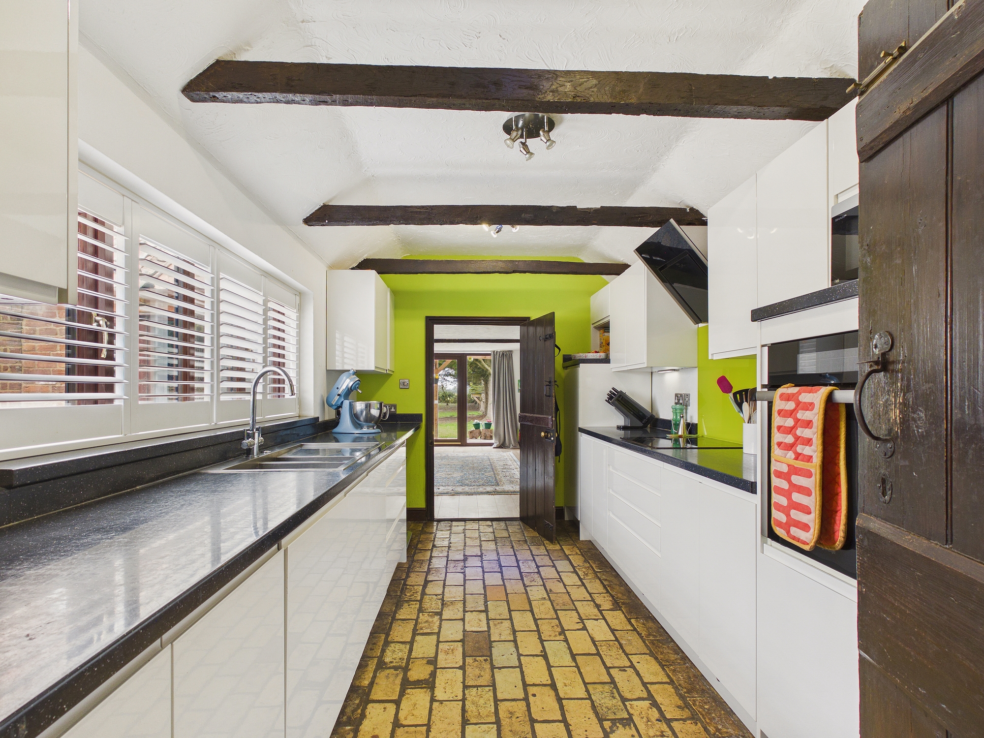 uPVC double glazed window to rear, gloss finish wall and base units under round edge worksurfaces, stainless steel sink drainer inset with mixer tap over, 4 ring induction hob inset to worksurface with extractor over, eye level over, space for American fridge/freezer, integral dishwasher, beams to ceiling, door to:-