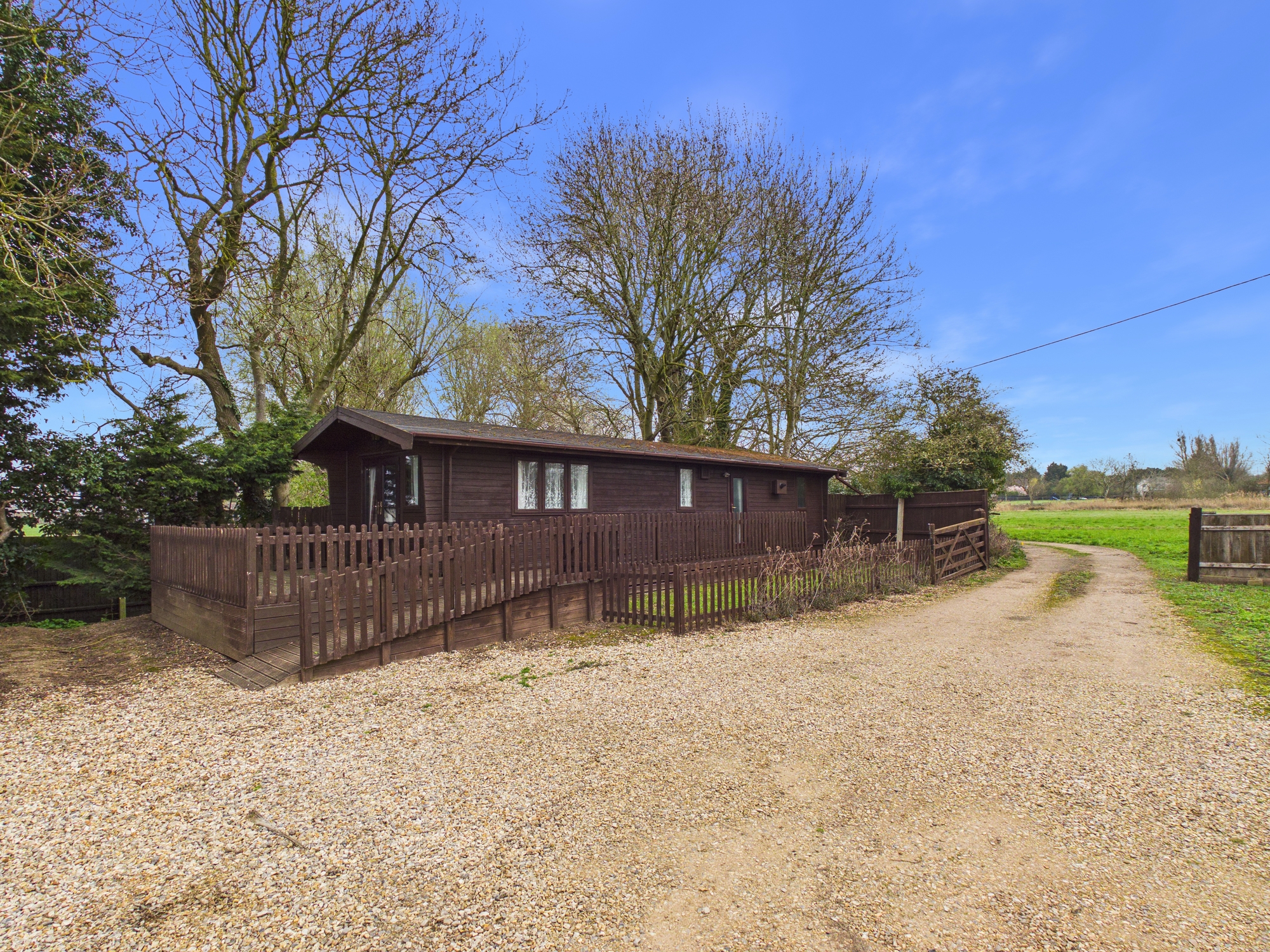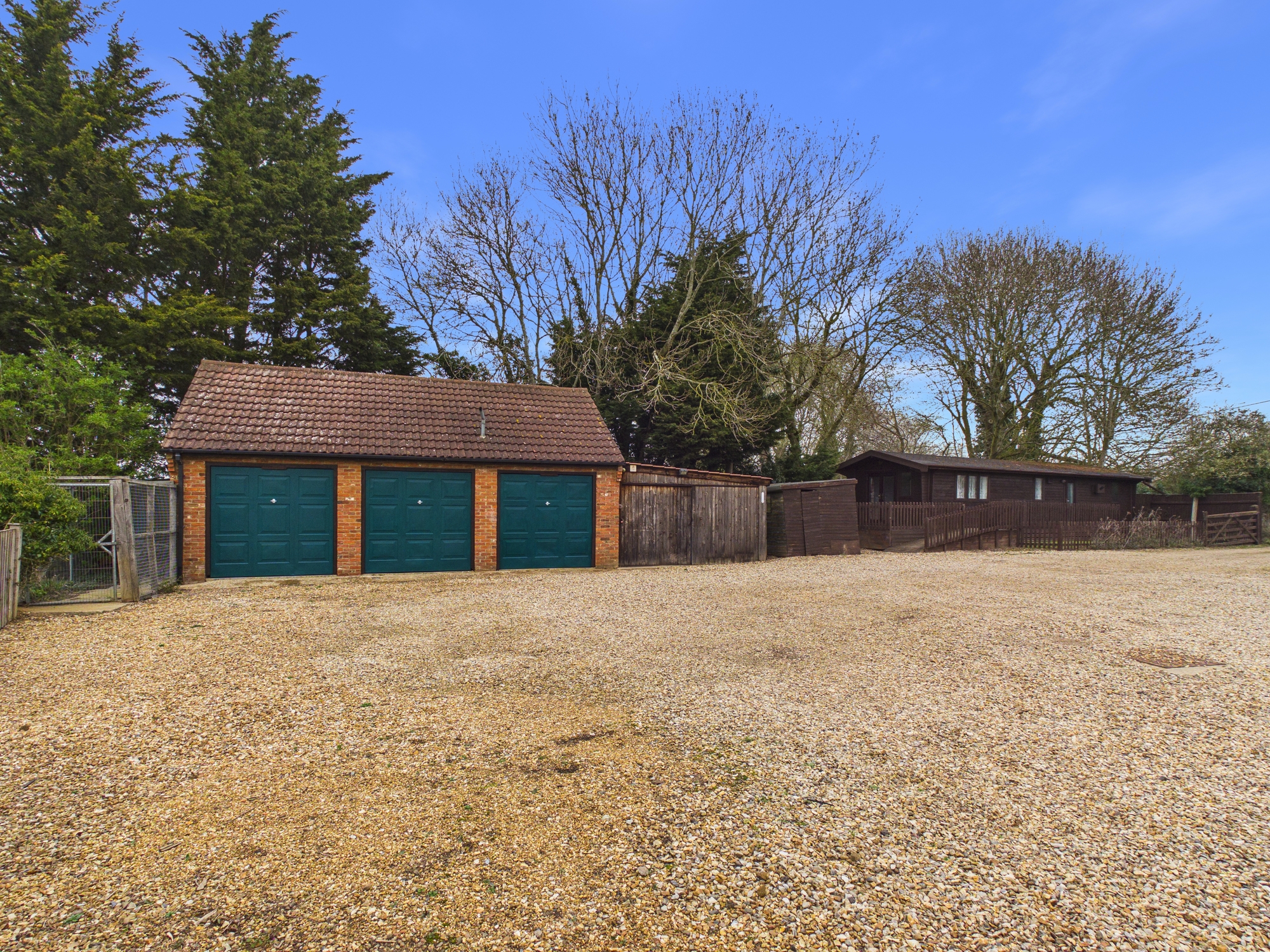 The overall plot measure approximately 1 acre (stms). The front of the property has a shingle driveway providing off road parking for several vehicles and leads to the triple garage, wooden workshop and storage shed along with the two bedroom lodge. There is also a patio and decked area to enjoy. To the side and rear it is laid to lawn with a range of mature trees inset and to borders surrounded by countryside views.