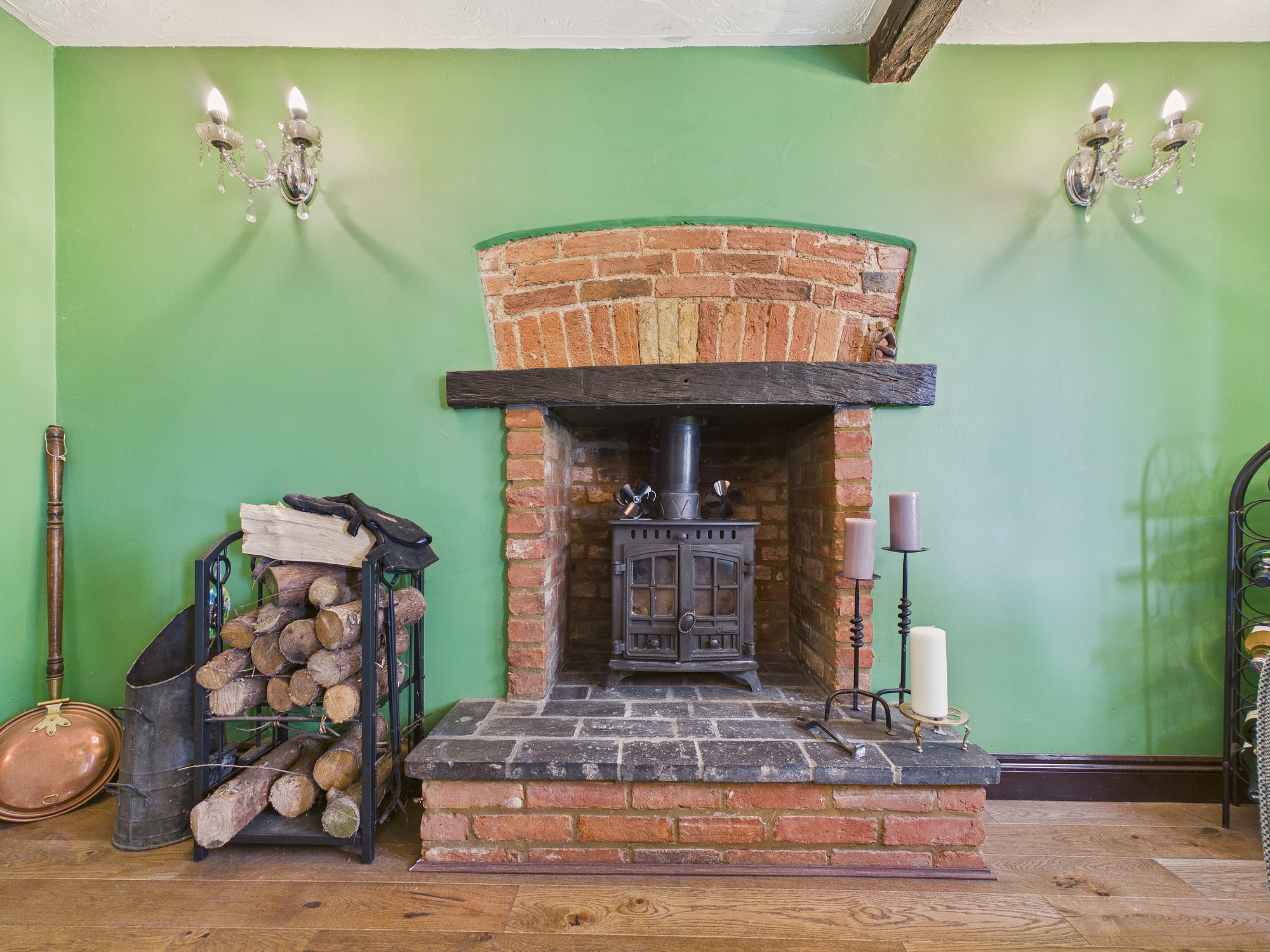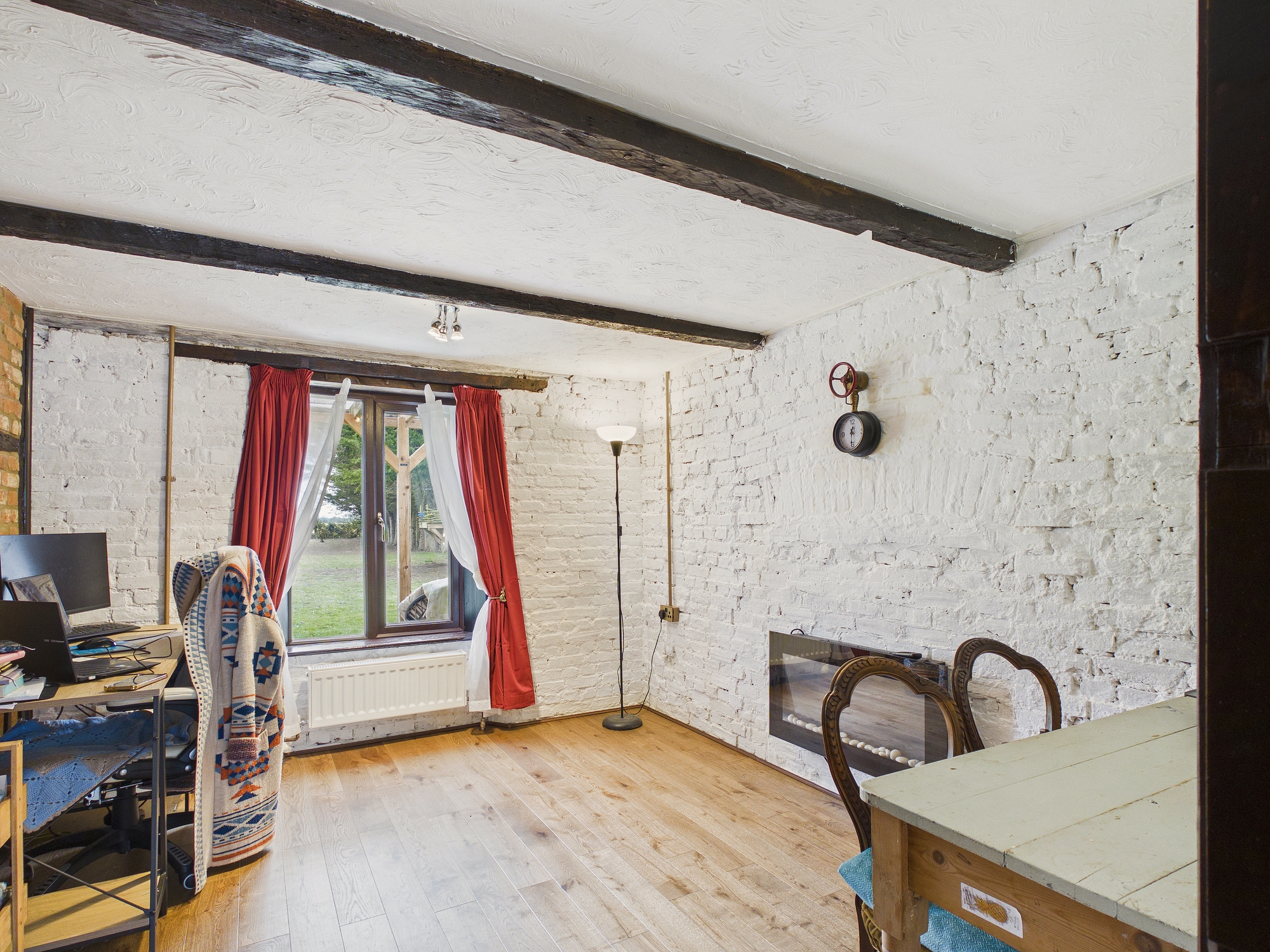 uPVC double glazed window to rear, wall mounted double panel radiator, wall mounted electric fire, engineered oak flooring, exposed brick walls with beams to ceiling.