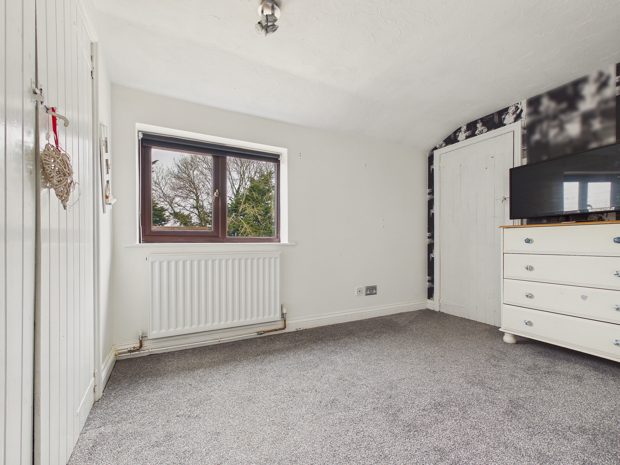 Window to rear, wall mounted single panel radiator, built in wardrobes and storage.