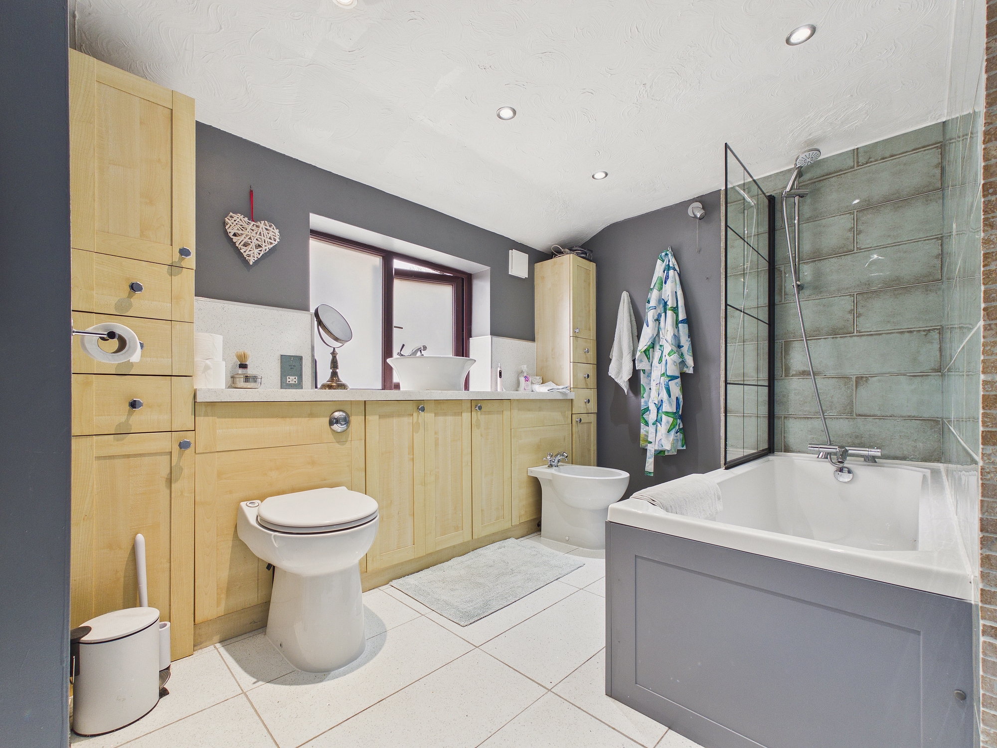 uPVC double glazed window to front, wall mounted heated towel rail, panelled bath with shower over and glass shower screen, concealed cistern w.c. and bidet inset to vanity unit with handwash basin, tiled flooring, ceiling spotlights, extractor.