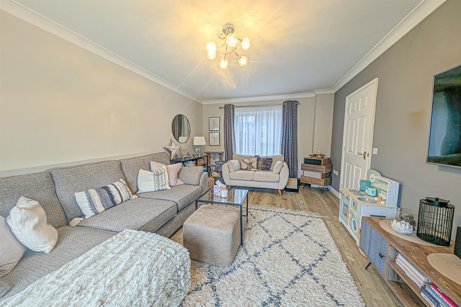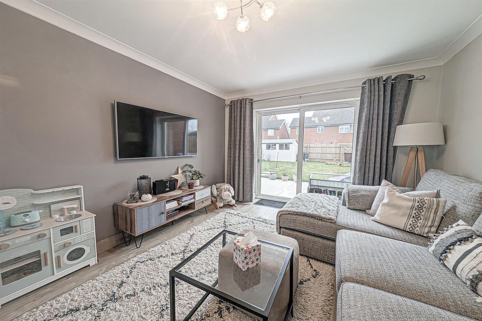 Spacious living room with LVT wood flooring. Sliding doors leading to the rear garden. Radiators. Window to the front aspect. Door leading to the entrance hall.