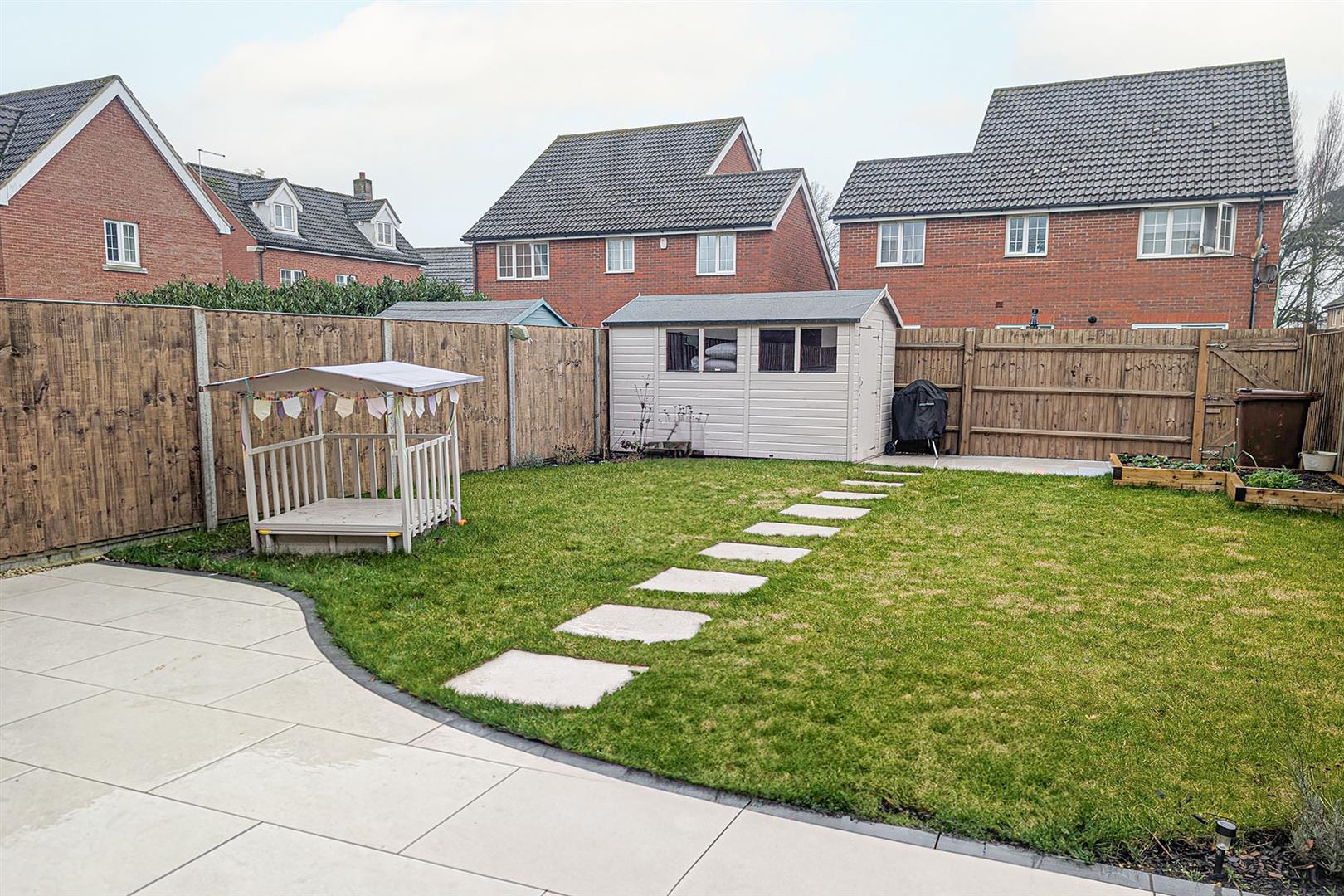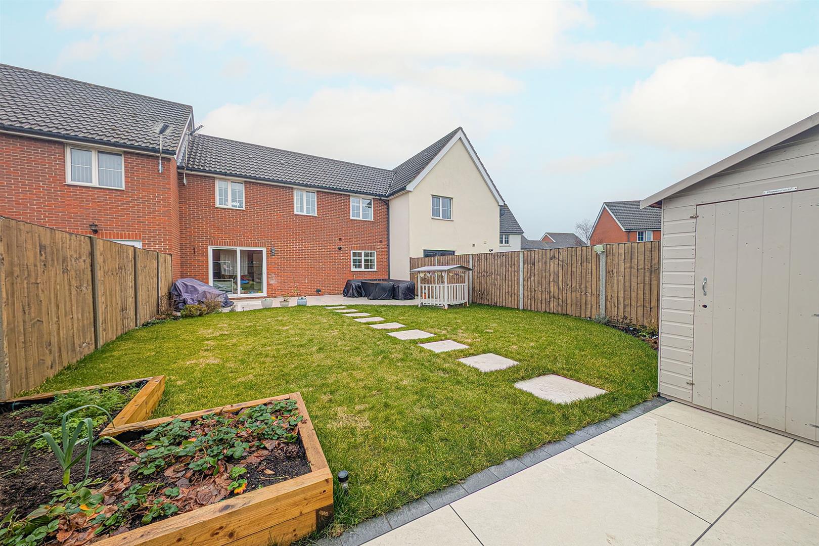 Attractive patio area to the rear of the house with sliding doors leading to the living room. Lawned area with stepping stone pathway leading to the rear of the garden. Timber shed. Access gate to the rear.