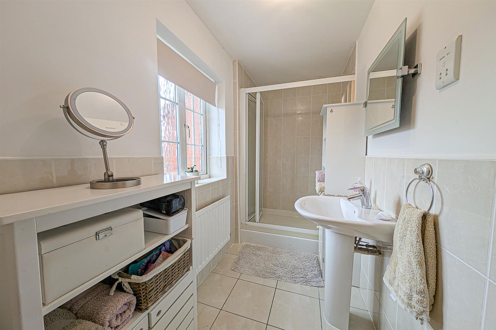 Modern white suite comprising low level W.C., pedestal handbasin with mixer tap over and generous walk-in shower. Attractively tiled to wet areas. Tiled flooring. Radiator. Obscured window. Door to Master bedroom.
