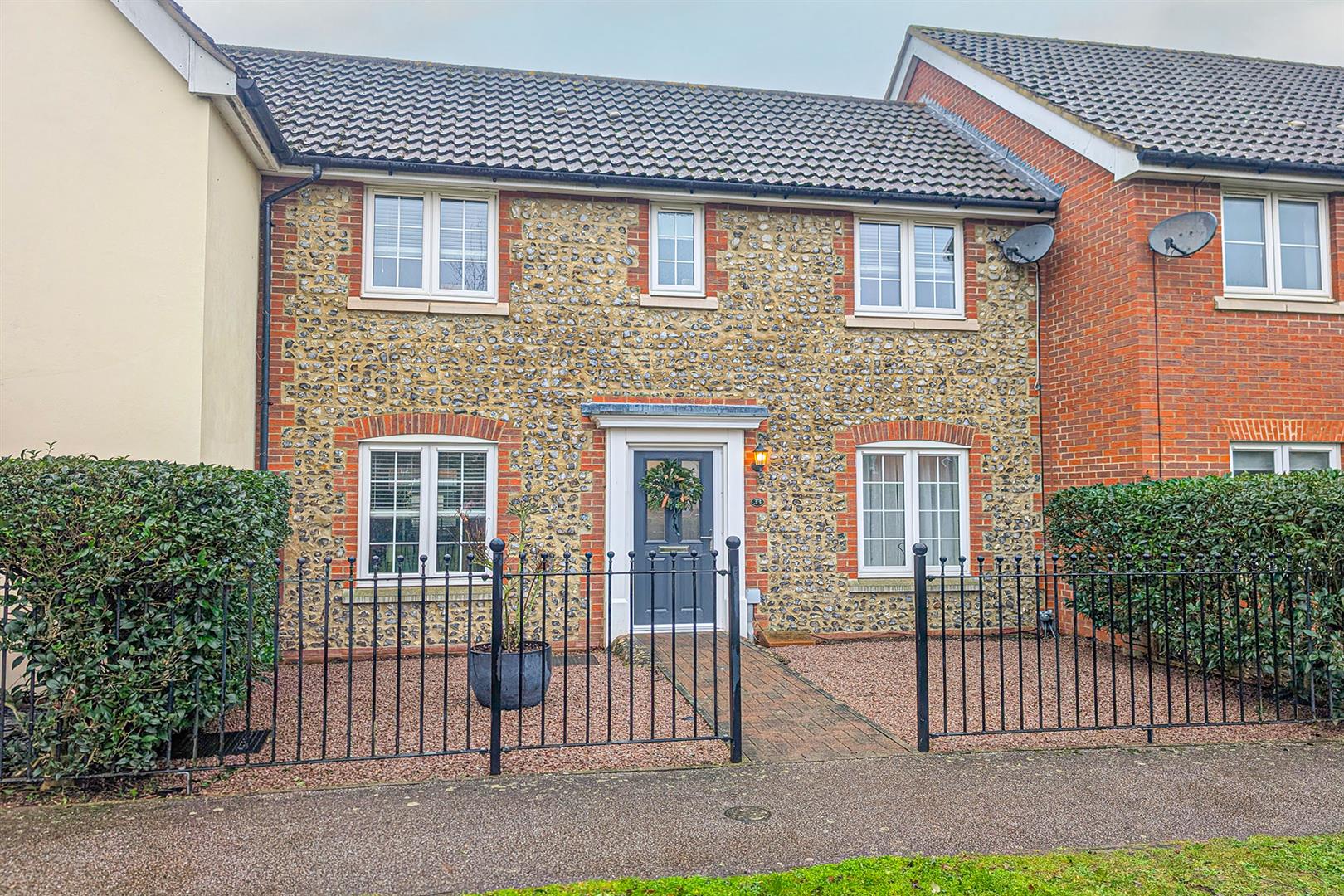 Gravel beds with central pathway leading to front door. Attractive railings and hedging to boundary.