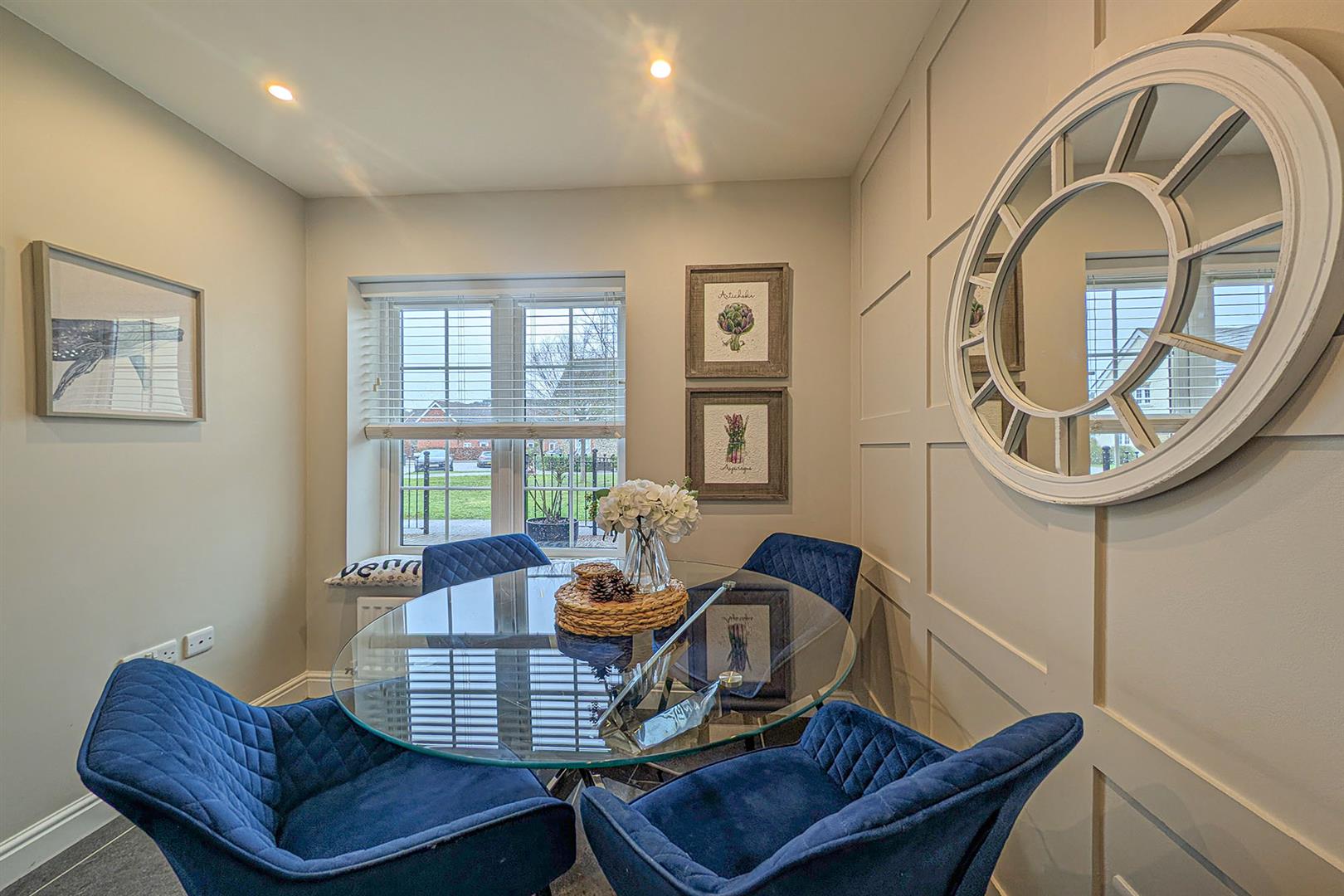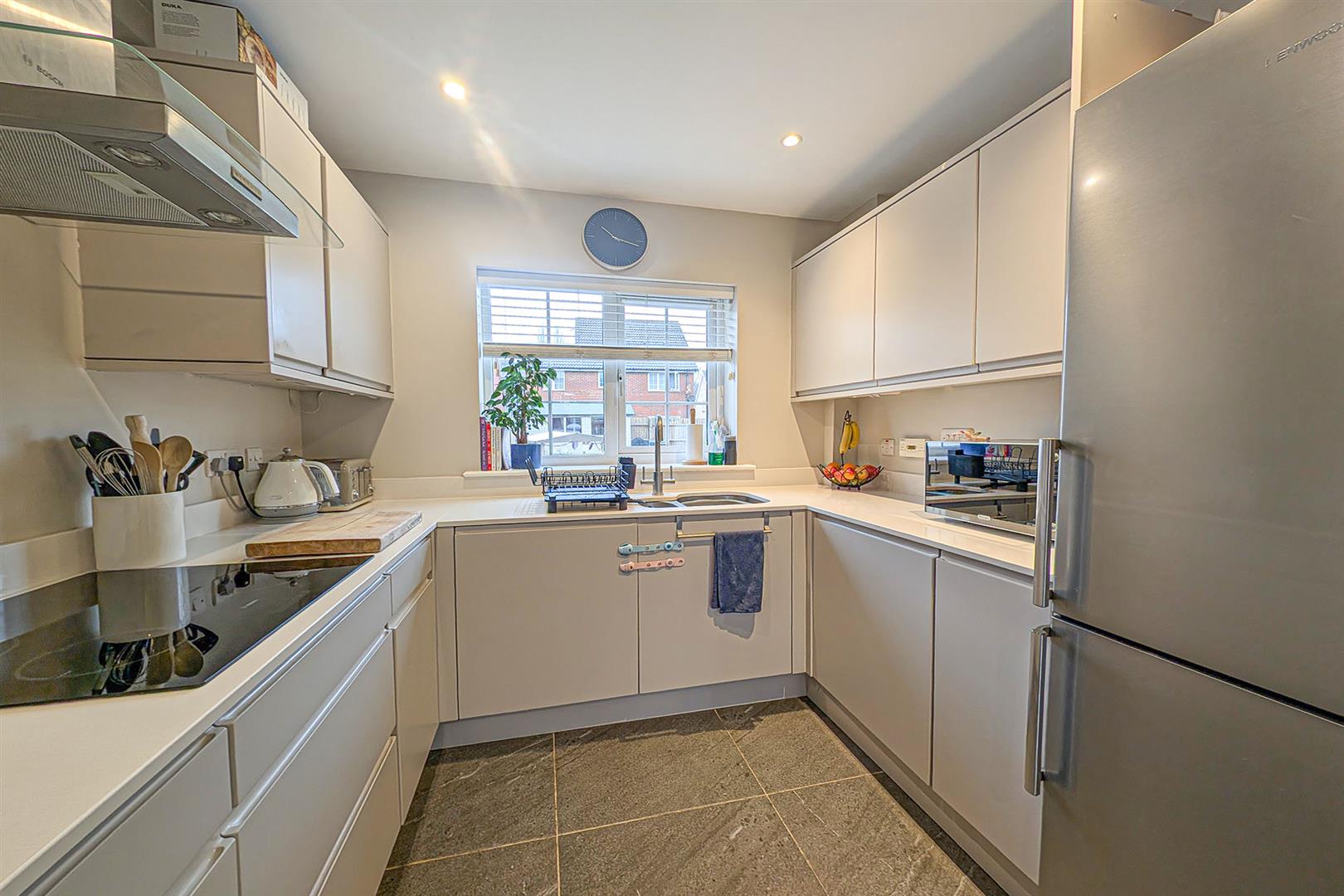 Contemporary range of eye and base level cupboards and storage drawers with a composite worktop over. Inset 1 1/4 bowl sink and drainer with mixer tap over. Inset induction hob with stainless extractor above. Integrated eye level oven. Space for fridge/freezer. Delightful dining area with panelled feature wall. Radiators. Tiled flooring. Dual aspect windows. Door to entrance hall.