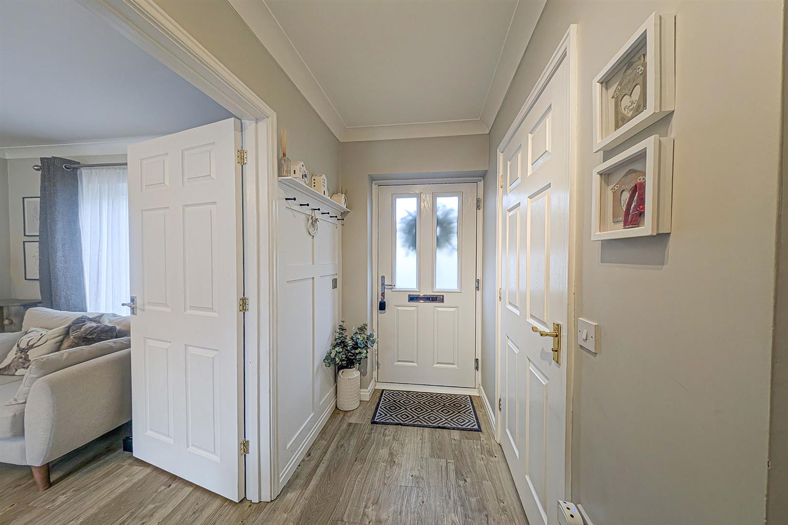 With doors leading to the kitchen/dining room, living room and cloakroom. Built-in storage cupboard. LVT wood flooring. Radiator. Stairs leading to the first floor landing.