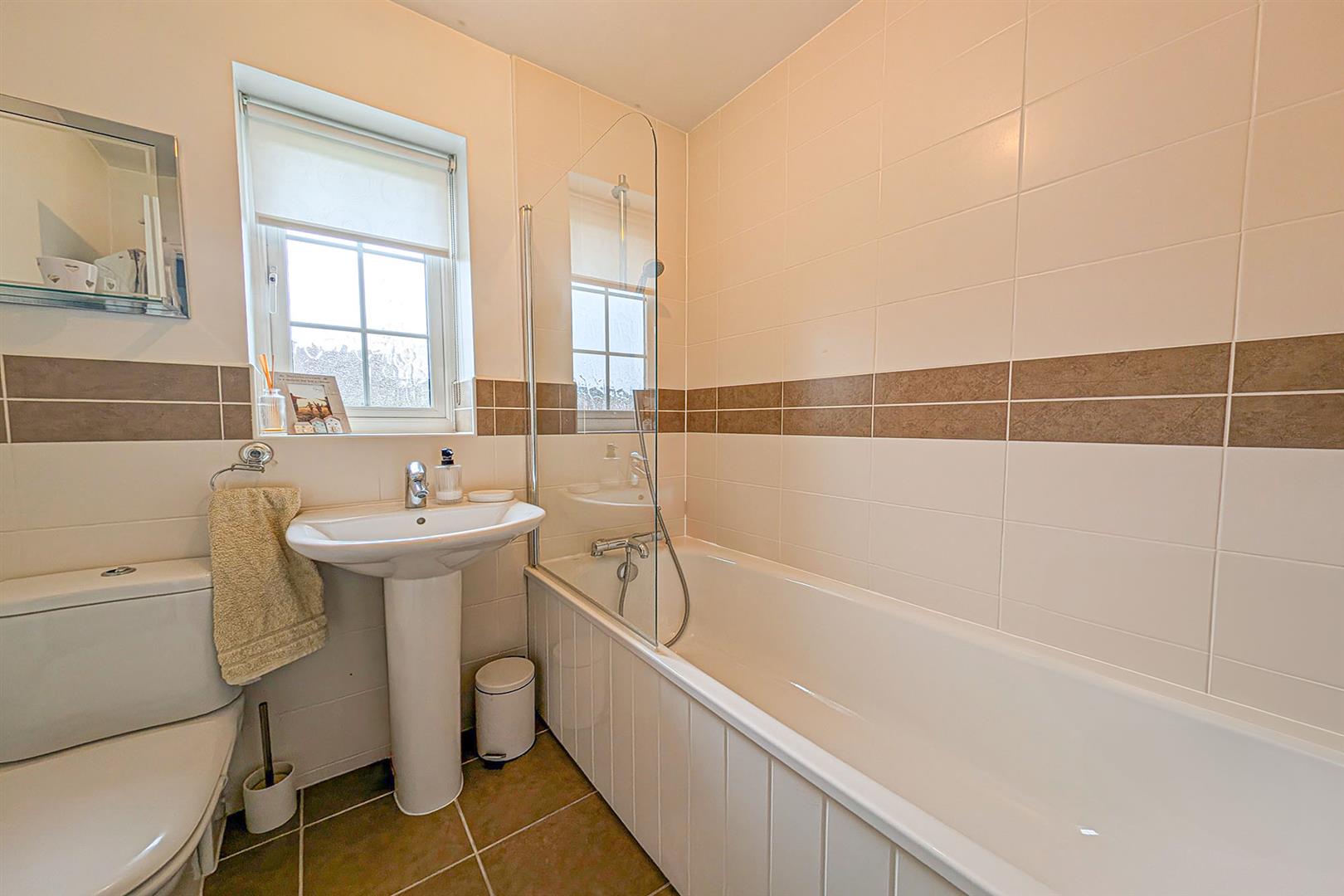 Modern white suite comprising low level W.C., pedestal handbasin with mixer tap over and panelled bath with mixer tap and wall mounted shower over. Attractively tiled to wet areas. Tiled flooring. Radiator. Door to the landing.