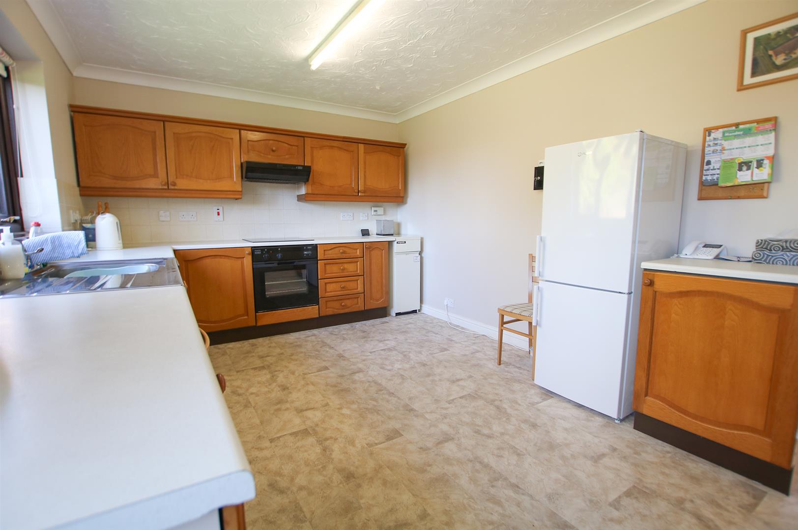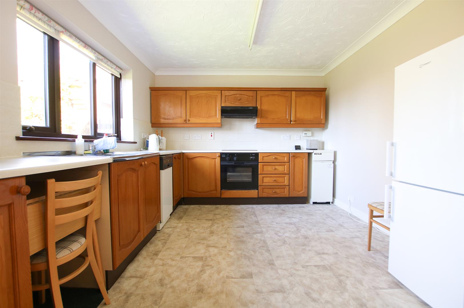Fitted with a range of matching eye and base level storage units with working top surface over. Stainless sink and drainer with mixer tap over. Integrated oven and hob with extractor hood over. Space and plumbing for white goods. Window and door to rear aspect.