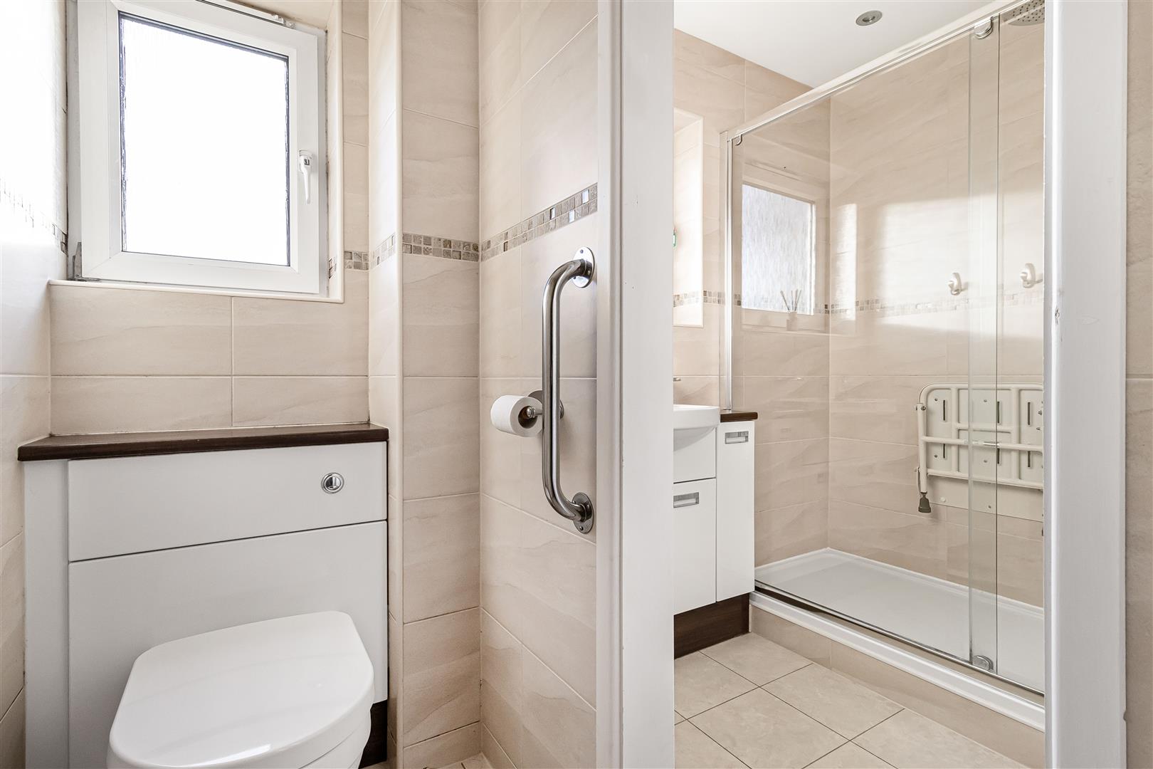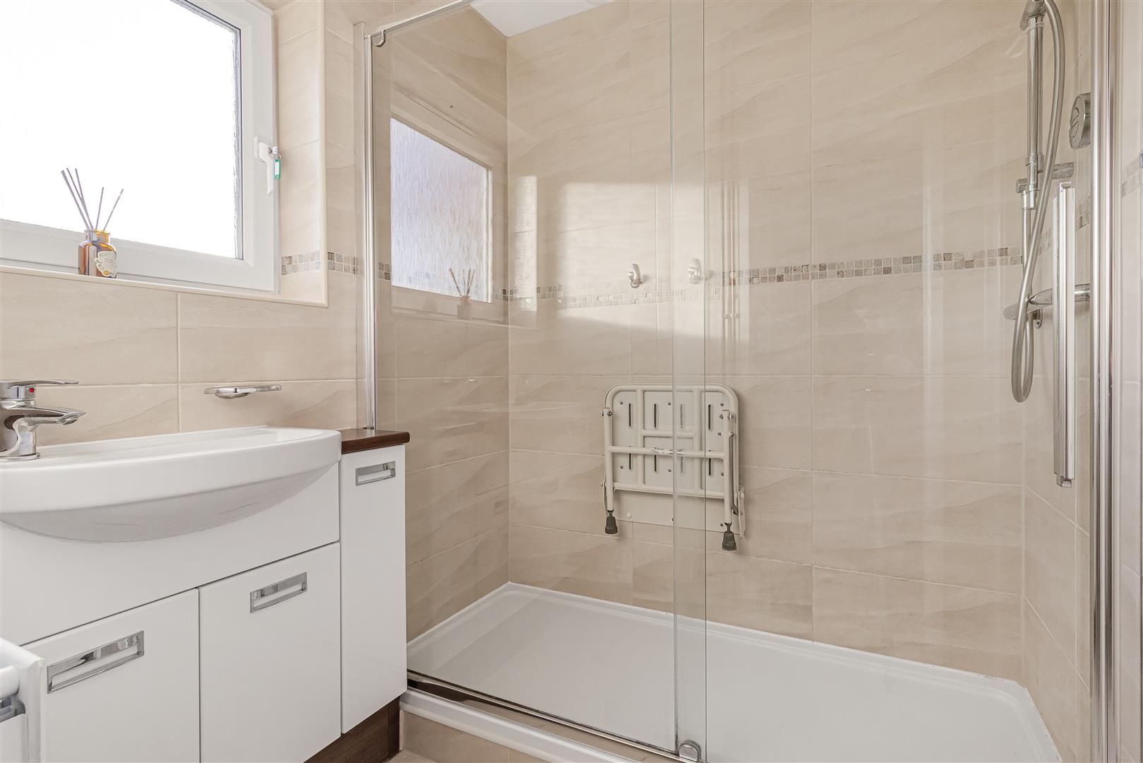 Modern white suite comprising low level, concealed cistern, W.C., inset hand basin with built-in storage under and generous walk-in shower. Attractively tiled throughout. Dual obscured windows. Radiator. Doors leading to Bedroom 1 and entrance hall.