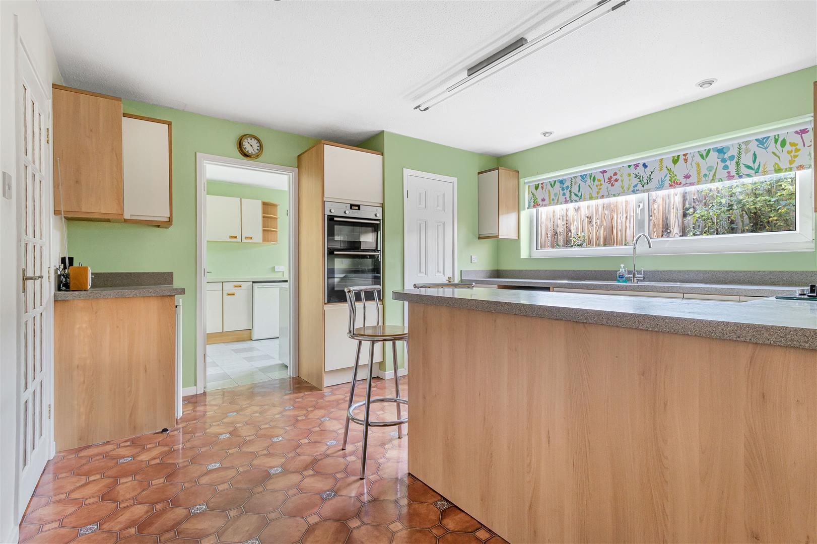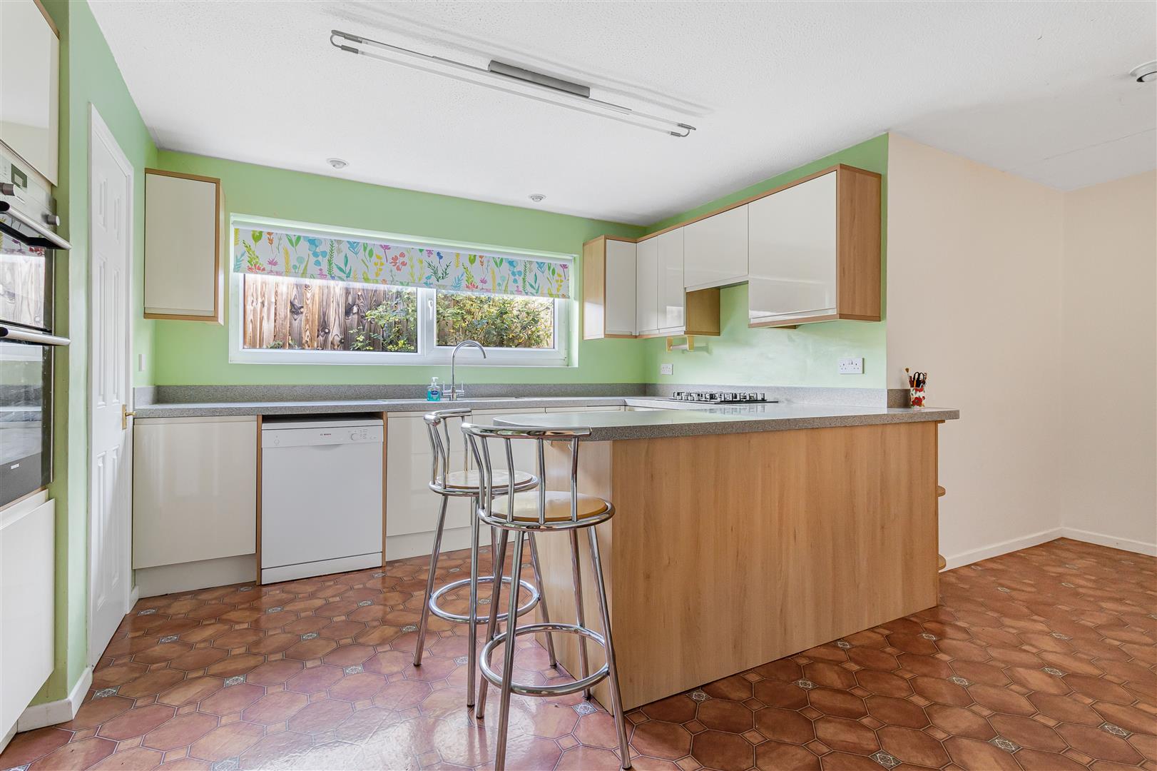 Modern range of matching eye and base level cupboards with worktop over, incorporating a breakfast bar seating area. Stainless steel sink and drainer with mixer tap over. Integrated double, eye level, oven. Inset gas hob with extractor over. Space and plumbing for dishwasher. Space for fridge/freezer. Built-in pantry cupboard. Radiator. Large window to the rear aspect. Internal window to the entrance hall. Glazed door to the entrance hall. Door to the utility room.