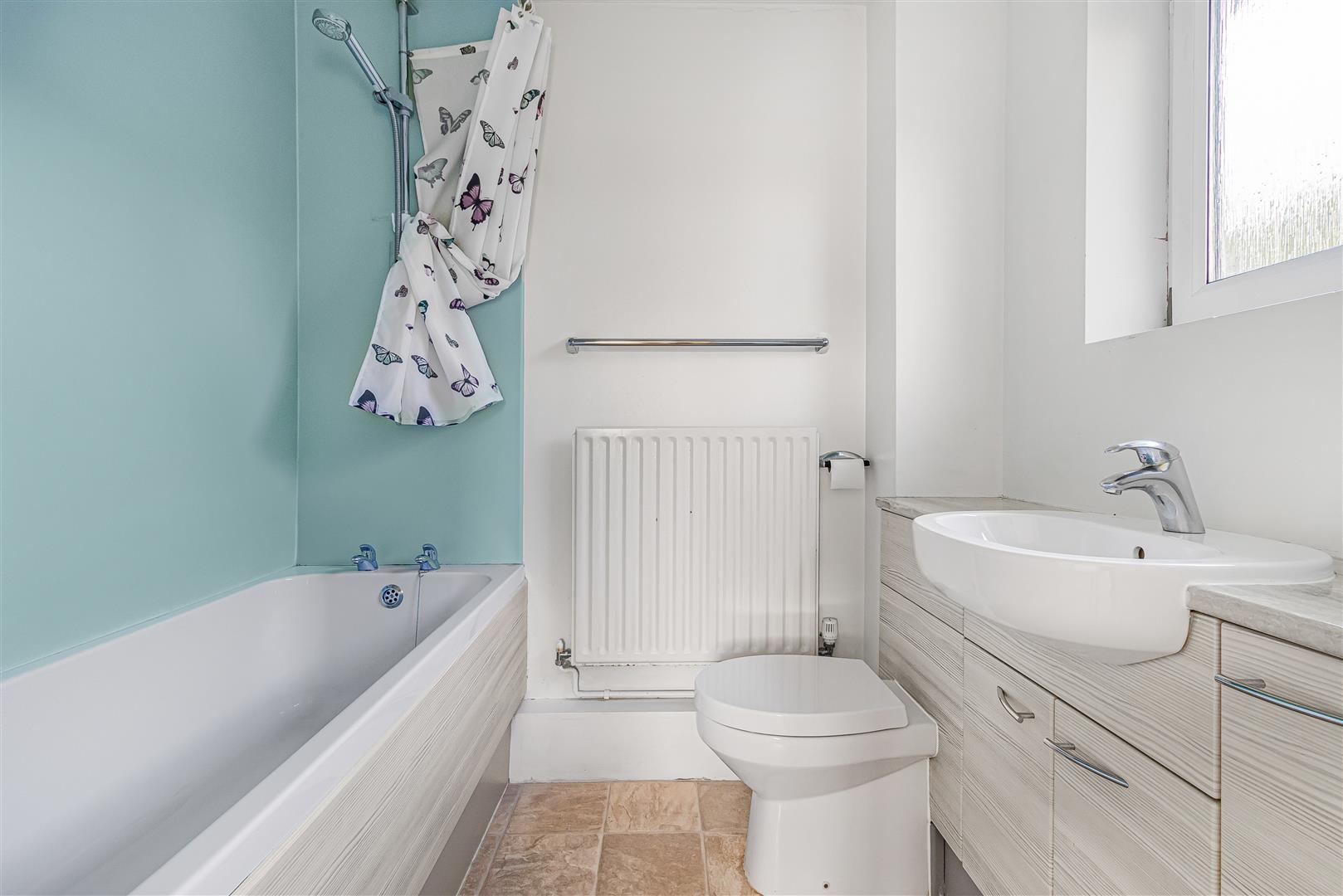 Modern white suite comprising low level, concealed cistern, W.C., inset hand basin with mixer tap over and built-in storage under with counter worktop and panelled bath with wall mounted shower over. Radiator. Obscured window. Door leading to Bedroom 2.