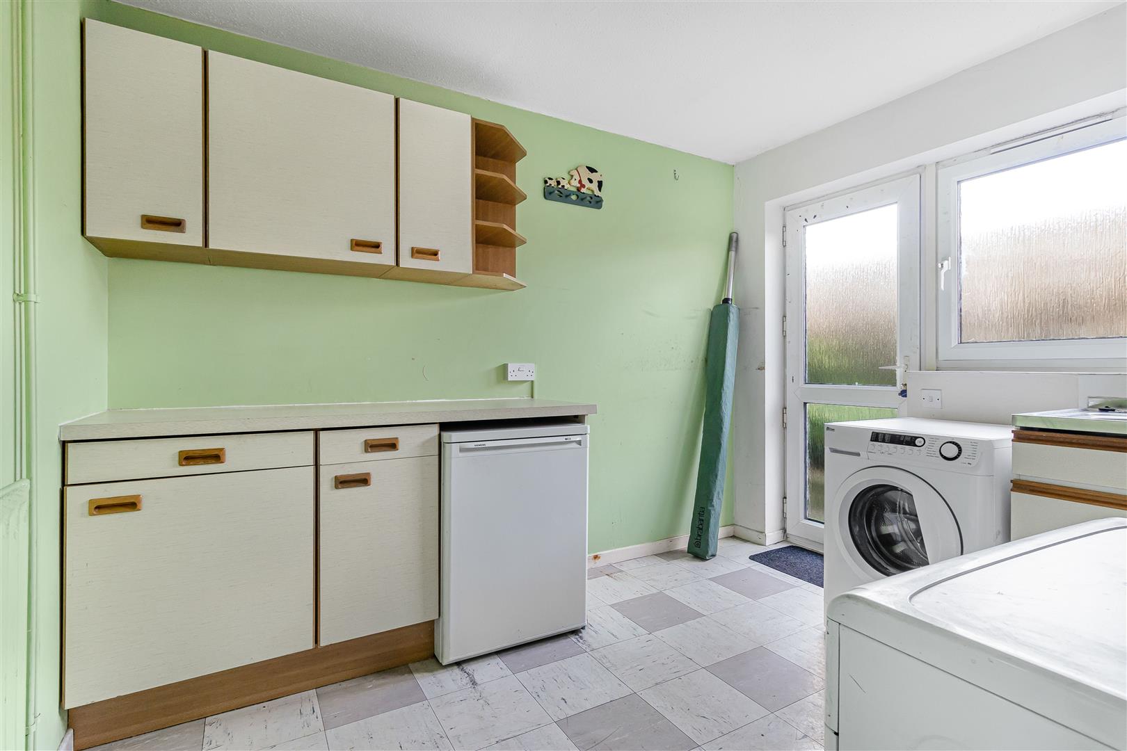 Range of fitted eye and base level cupboards with work top over. Space and plumbing for washing machine. Spaces for other appliances. Obscured window to the rear aspect. Glazed door to the rear garden. Radiator. Door to kitchen/breakfast room.