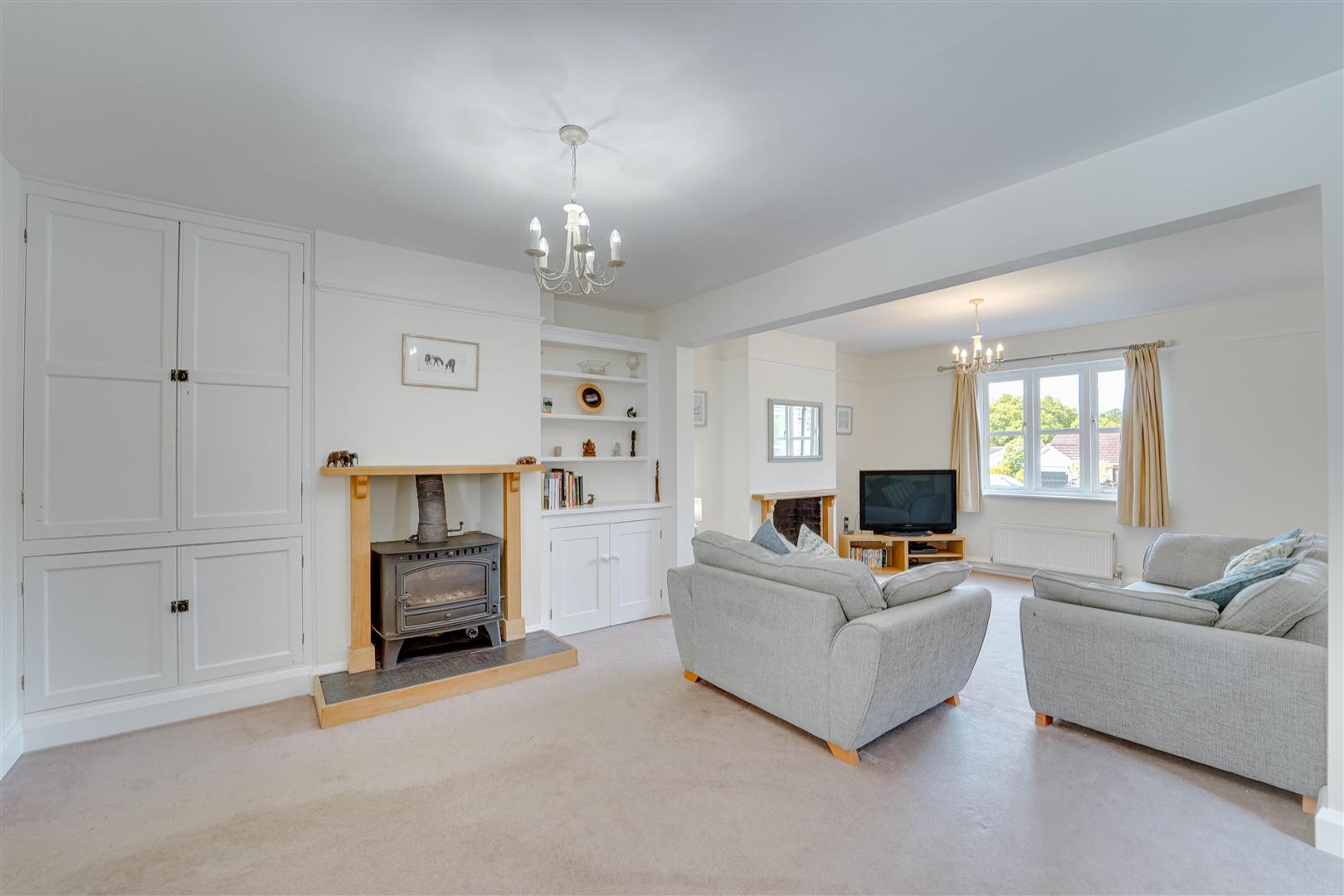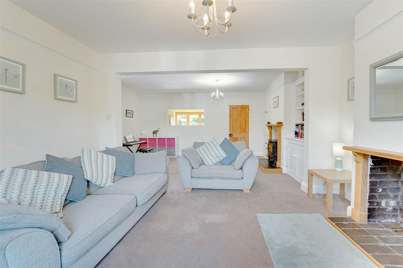 Generous sized living room with featured log burner. Open fire with tiled hearth and attractive oak surround. TV connection point, built in shelving and cupboards, a further storage cupboard, radiator and window to the front aspect.