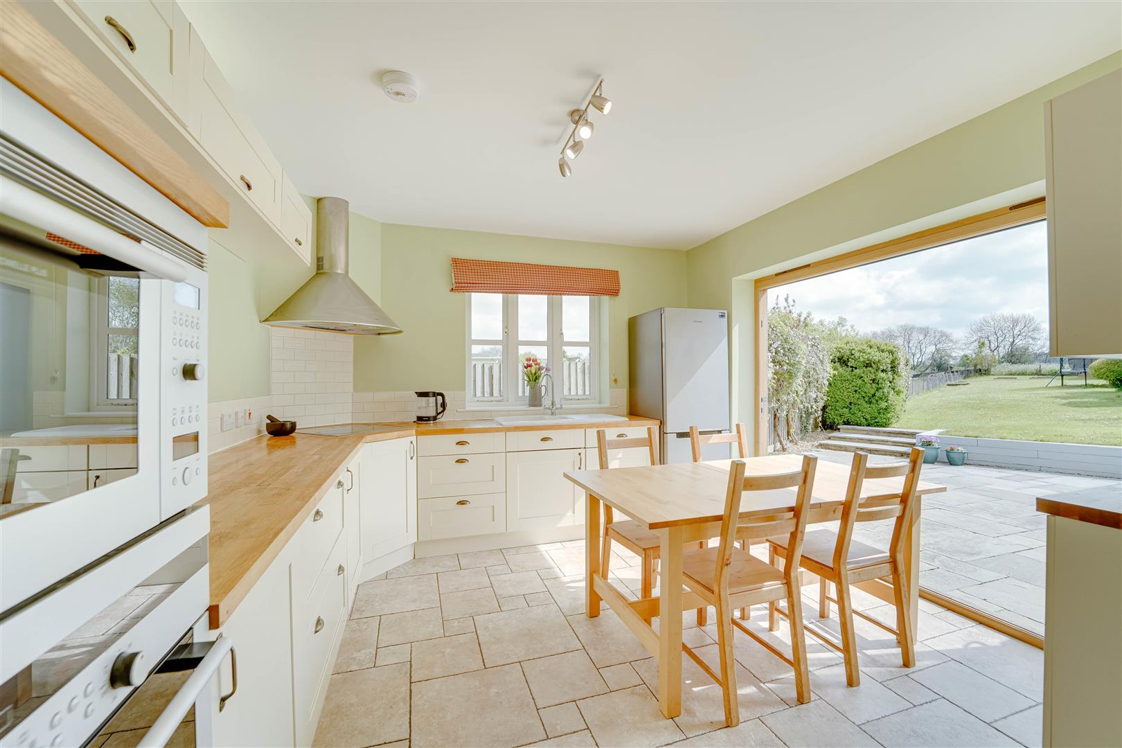 Fitted with a range of matching eye and base level storage units with solid wood worktops, ceramic sink and drainer with mixer tap. Integrated appliances to include eye level oven and microwave, fridge and freezer. Ceramic hob with extractor hood above. Integrated dishwasher. Space for freestanding fridge/freezer. Tiled flooring, access through to the utility room. Underfloor heating. Window to the side aspect and bi-folding doors out to the rear garden.