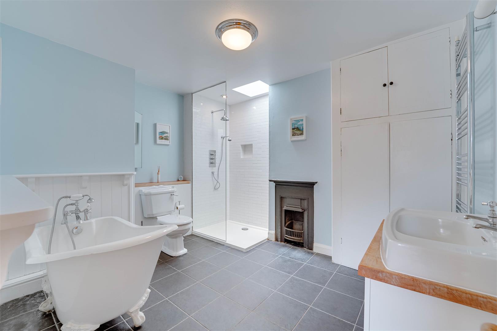Modern fitted bathroom suite comprising of a low level WC, wash basin with vanity under, free standing bath with shower attachment, walk-in shower with glass screen, storage cupboard, heated chrome towel rail, tiled flooring and Velux window.