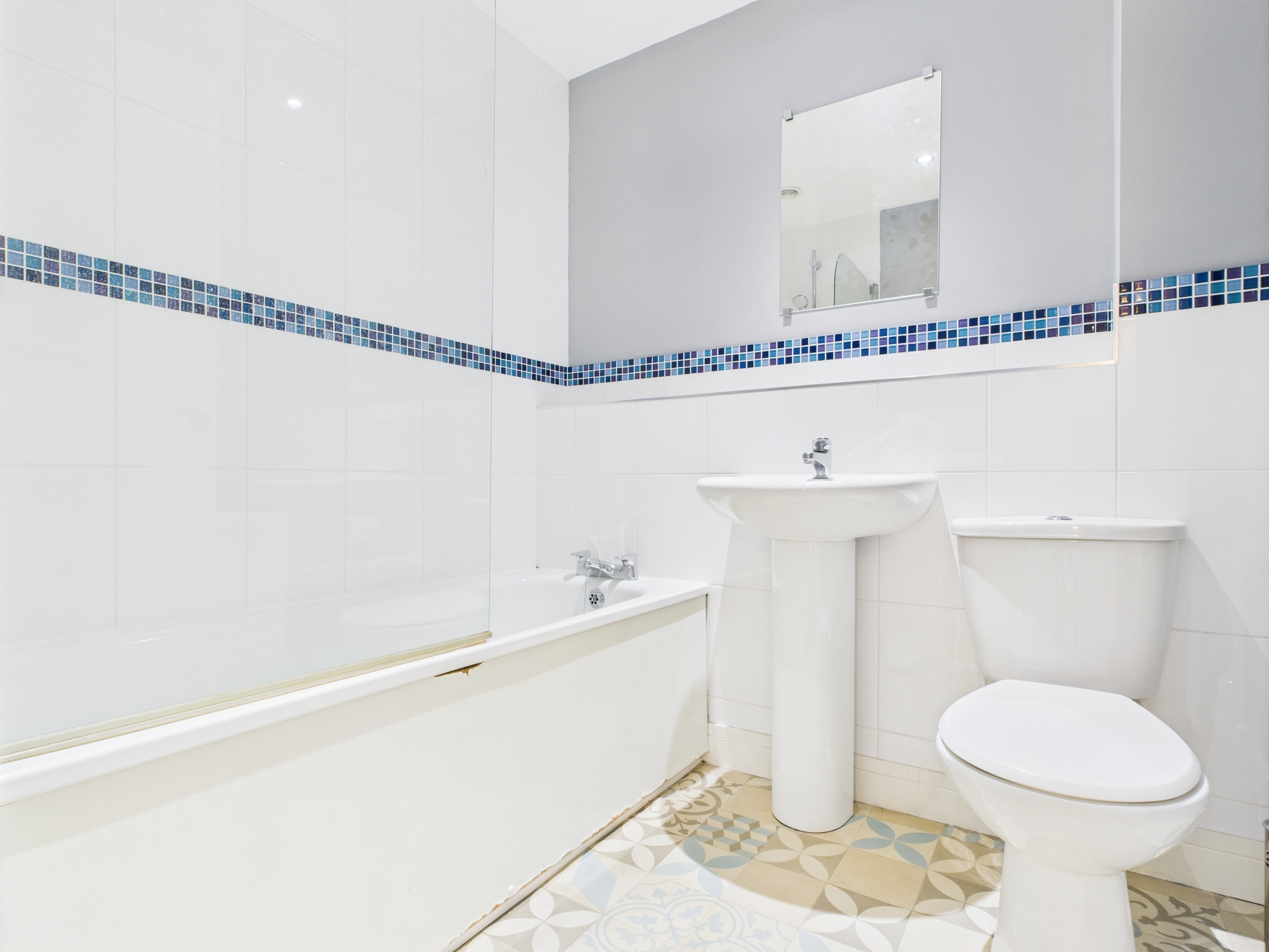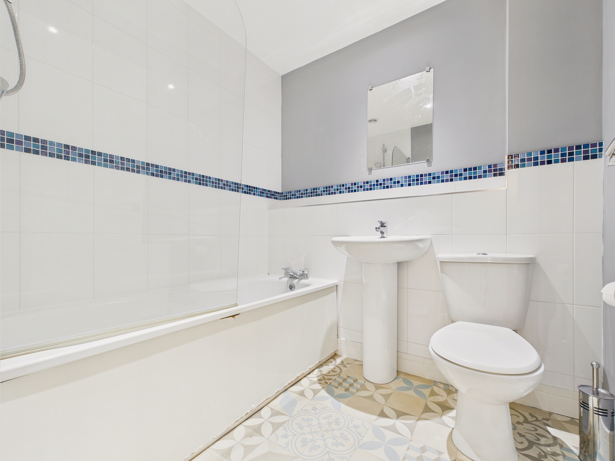 Wall mounted double panel radiator, panelled bath with wall mounted shower and glass screen, pedestal hand wash basin, w.c., lino style flooring, extractor.