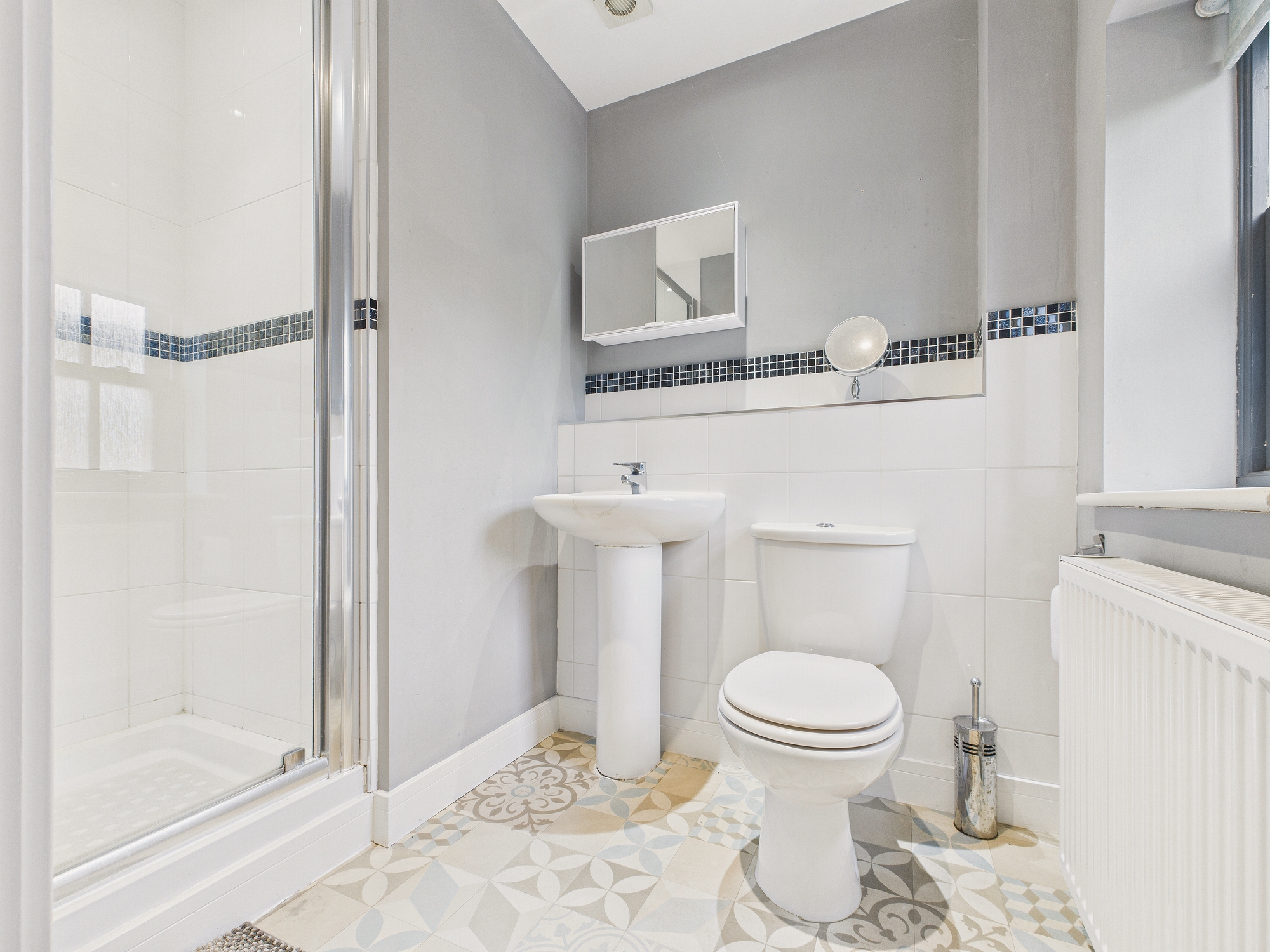 Double glazed window to front, wall mounted double panel radiator, single shower cubicle, tiled to surface with glass door, w.c., pedestal hand wash basin, extractor, ceiling spotlights, lino flooring.