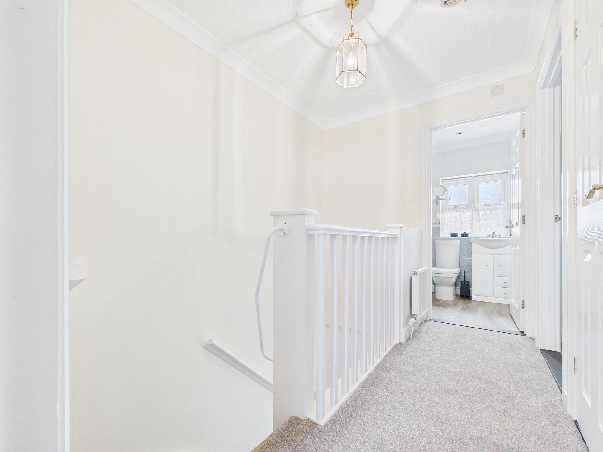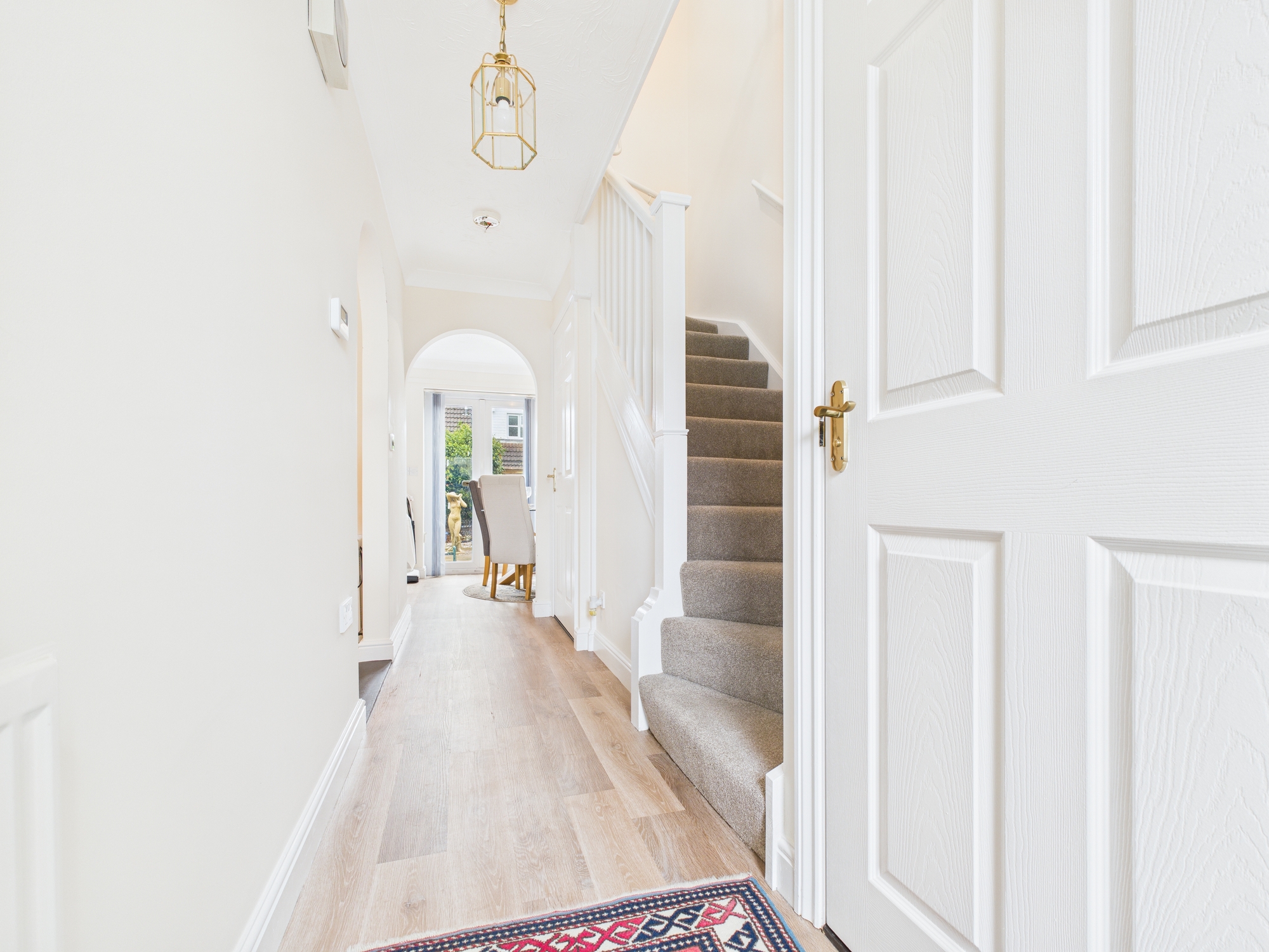 Wall mounted single panel radiator, stairs to first floor with storage cupboard under, LVT (luxury vinyl tiled) flooring, access to ground floor rooms.
